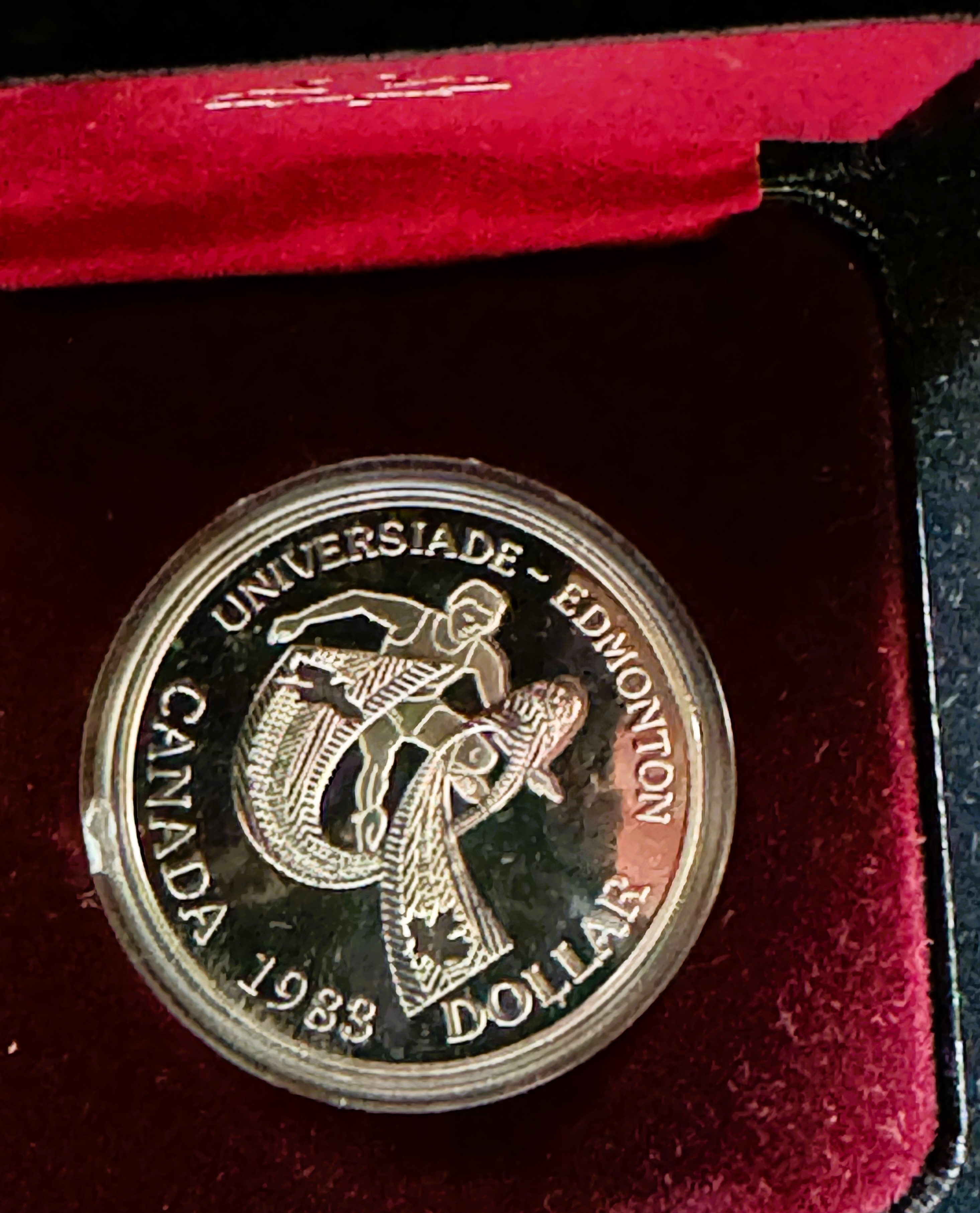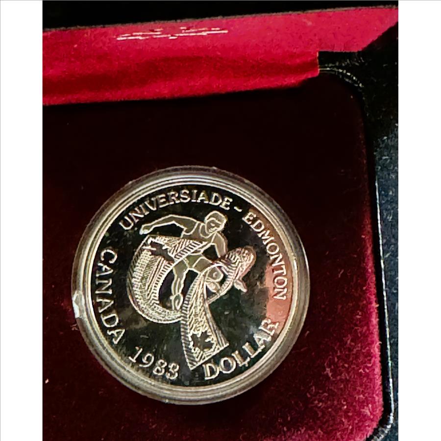 1983 CANADA EDMONTON UNIVERSIADE GAMES, $1 DOLLAR SILVER PROOF COIN, LUSTROUS GEM IN ORIG RCM CAPSULE/CASE