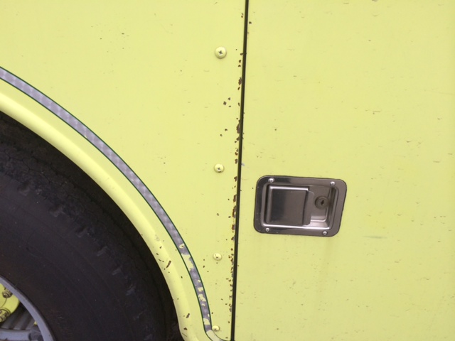 The Agency has reported the following known information and defects: Several paint chips throughout and there is damage to the compartment door on the driver's side. Interior has normal wear and tear. Small patches of visible rust in several places (see images for more details). Maintenance records available from 1991-present. This unit was last started in June of 2014.