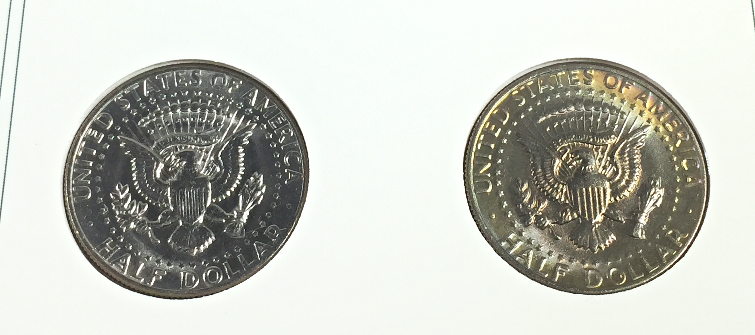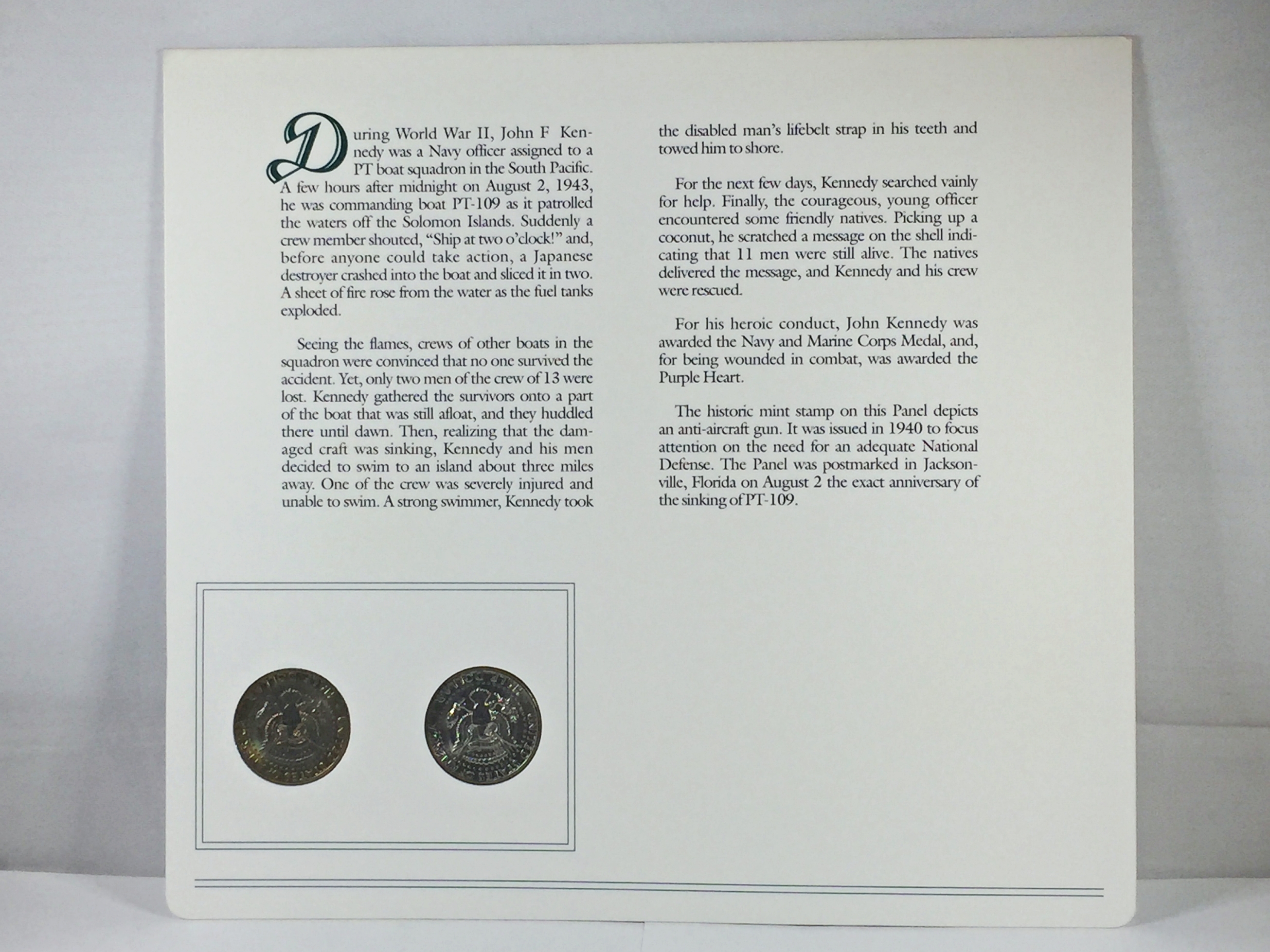 1983-D & P Kennedy Half Dollars & 2 Stamps*Encased in 9" x 10" Story Board Commemorating JFK/PT-109 Crew