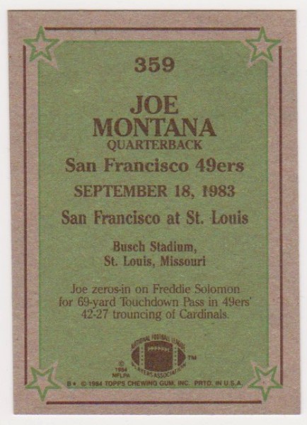 This is a 1984 Topps Joe Montana #359 card.  It is in approximately VG-EX to EX condition. It has light wear and is off center/miscut, but overall this is still a nice original 41 year old card of this NFL Hall of Famer.