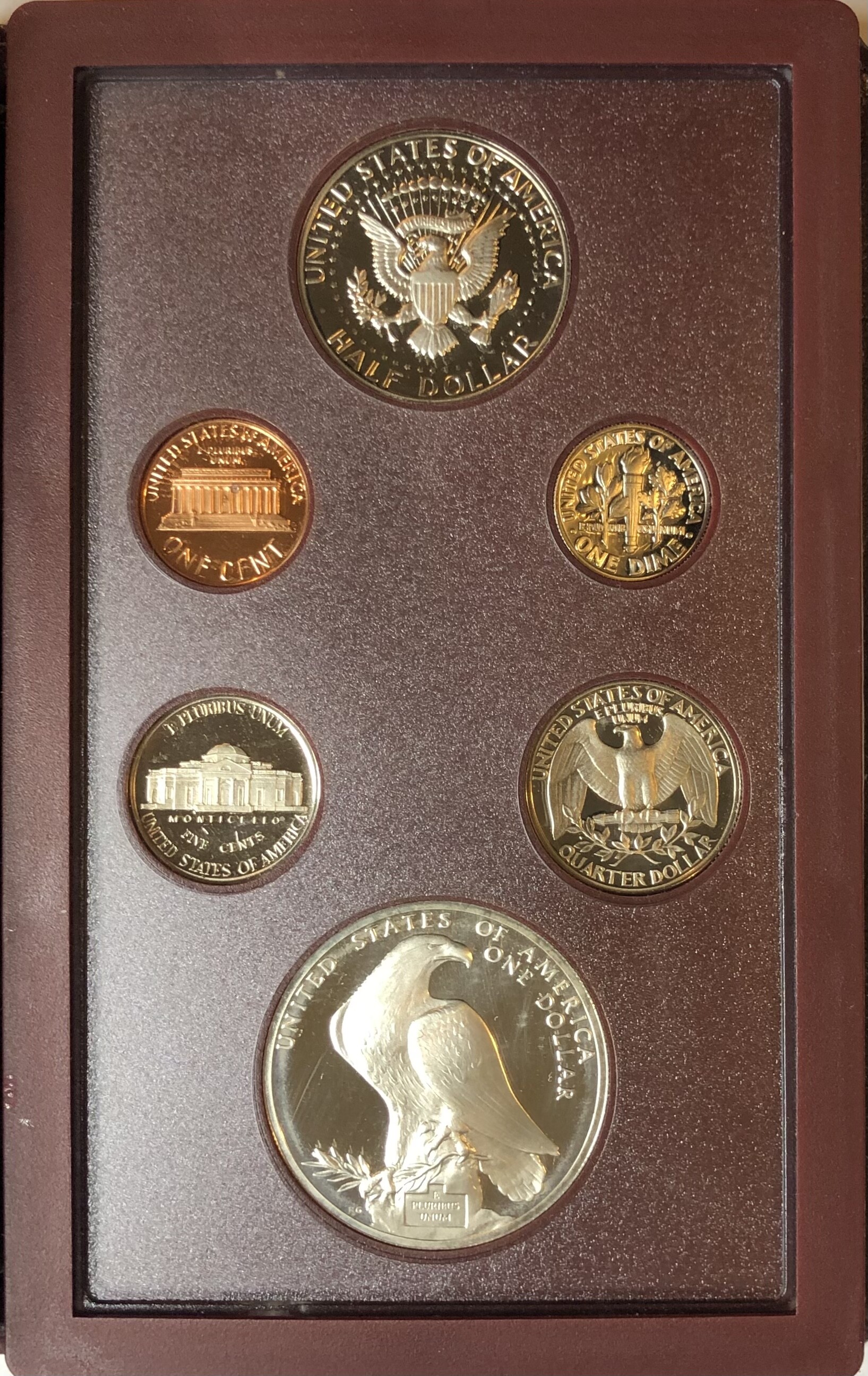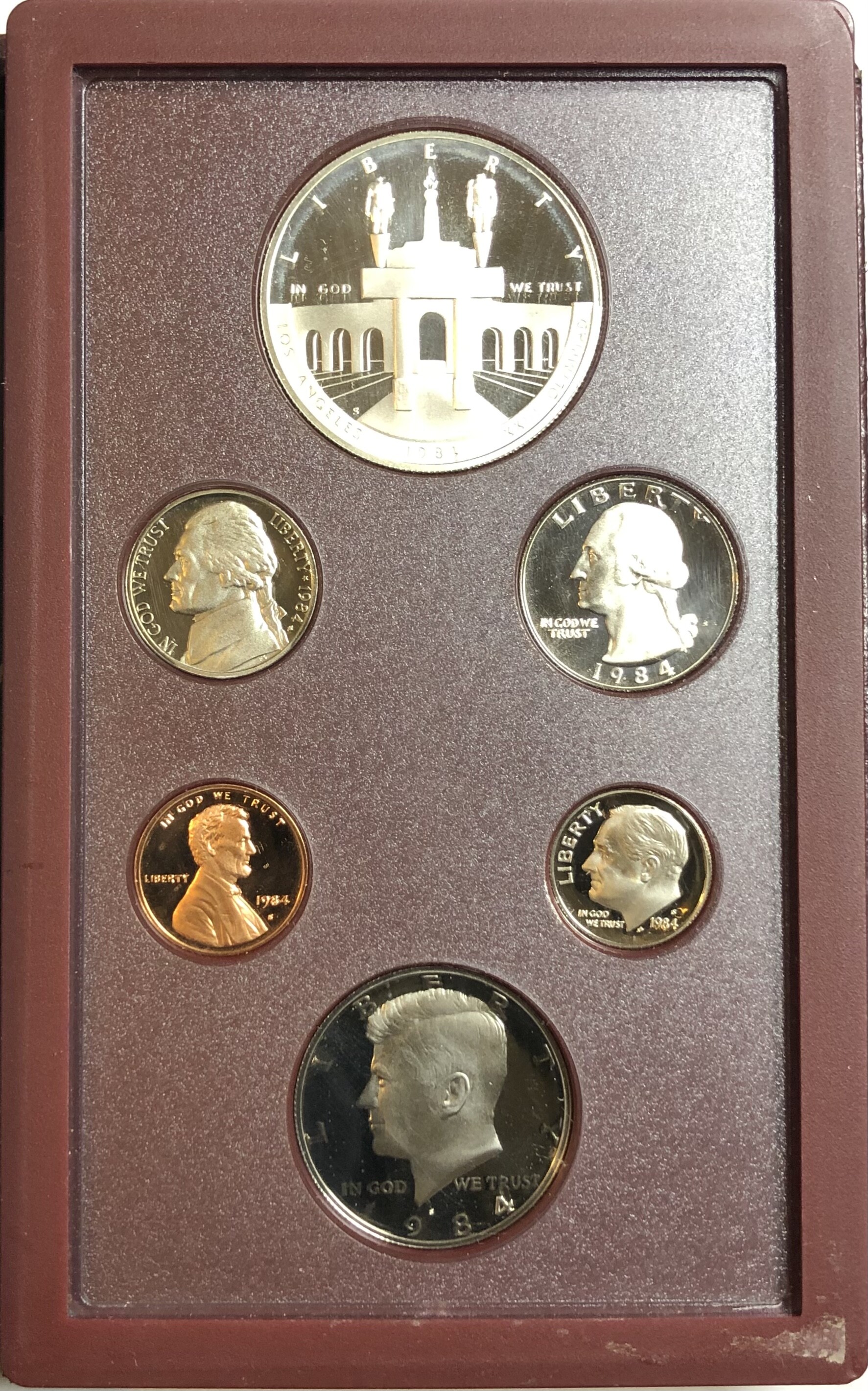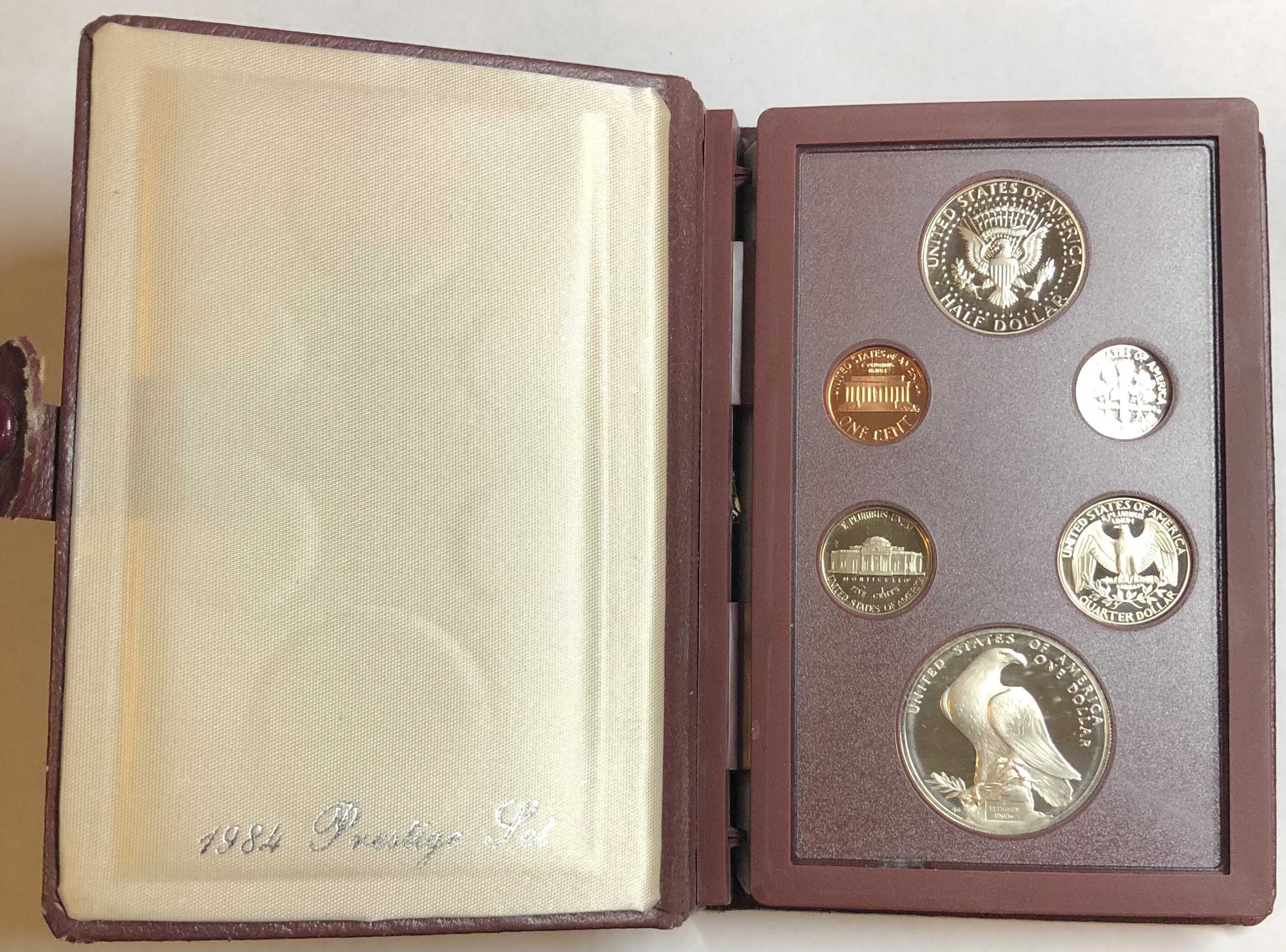 >1984-S U.S. Mint Olympic Prestige Set - 6 Coins Including Silver Gateway One Dollar - Stunning Set in Leather Book!