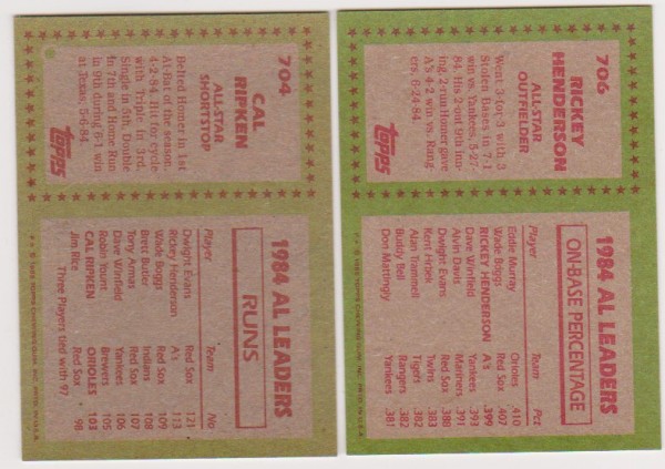 1985 Topps Cal Ripken #704 + Rickey Henderson #706 Card Pair