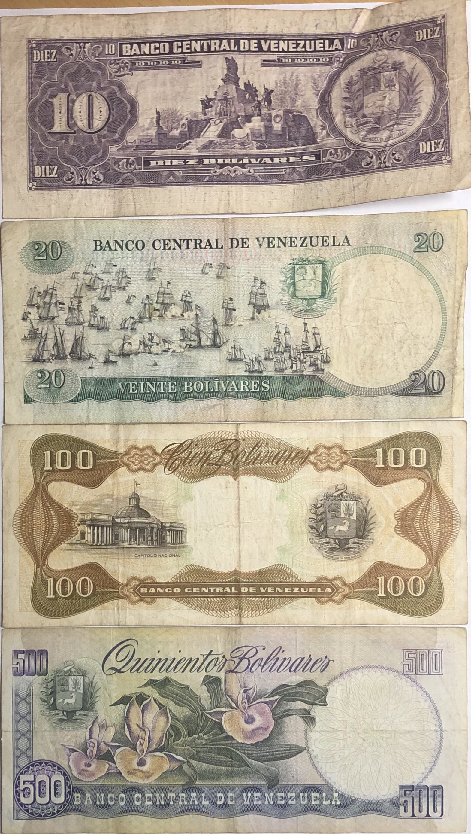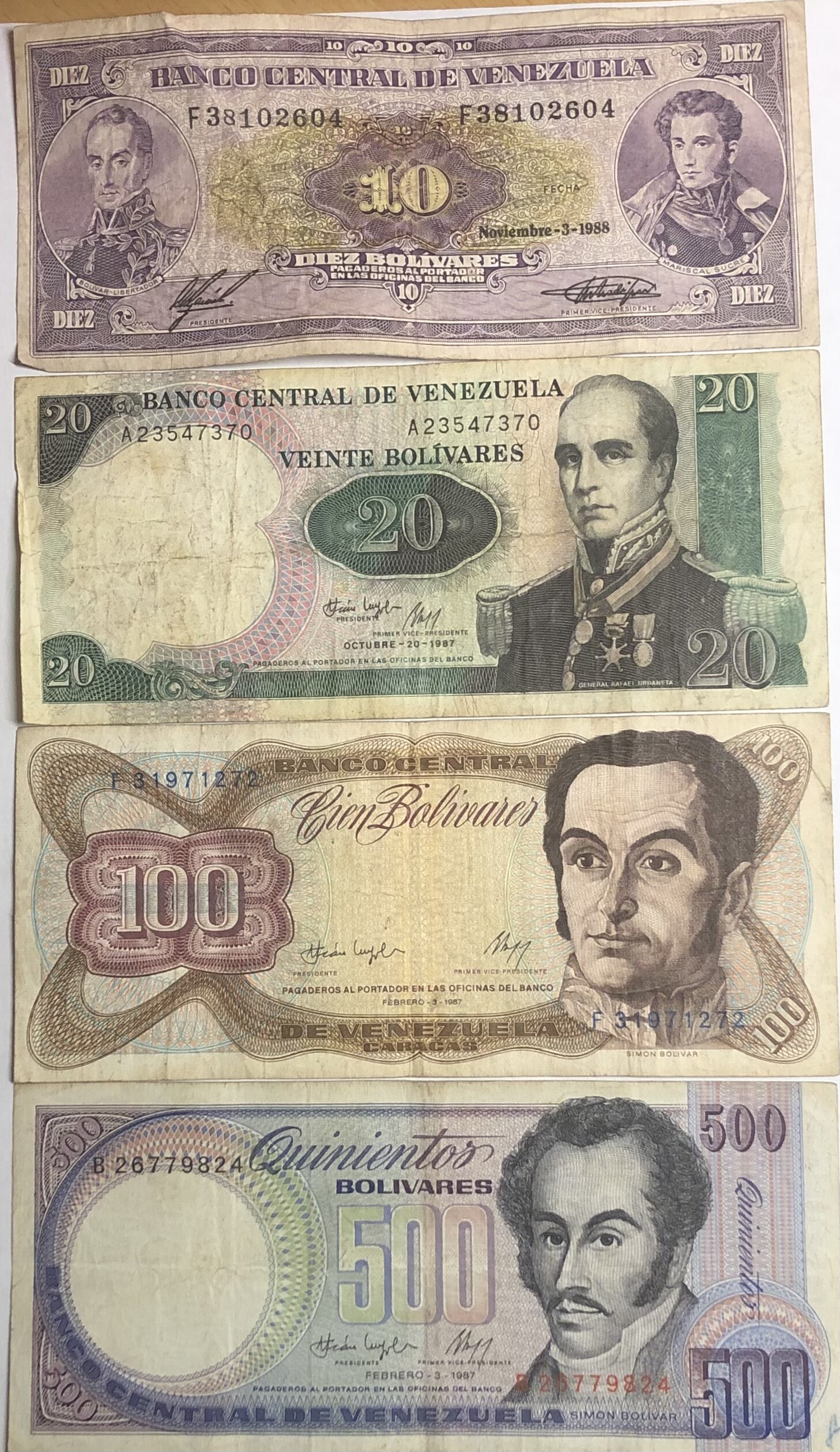 >1987 & 1988 Venezuela Currency - 1987 $20, $100 & $500 Notes and 1988 $10 Note
