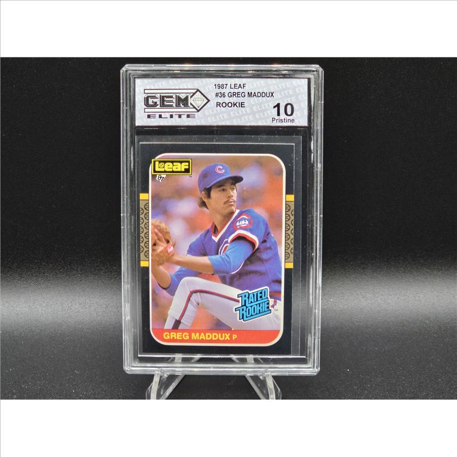 This auction is for a 1987 Leaf #36 Greg Maddux Rookie Card Graded 10 by GEM.