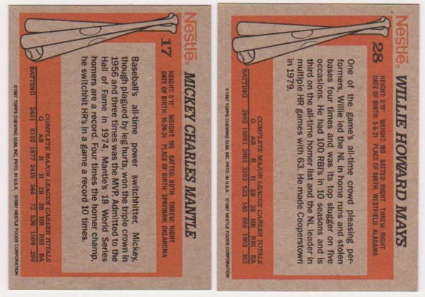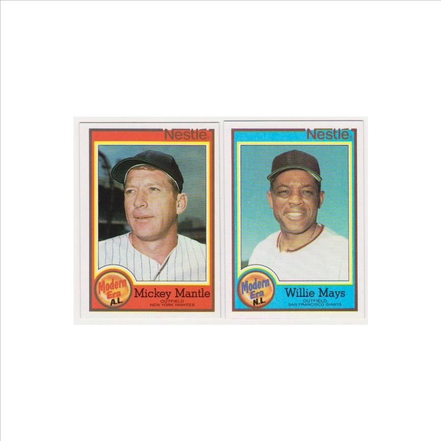 This is a pair of 1987 Topps Nestle baseball cards.  You get one each of Mickey Mantle #17 + Willie Mays #28.  The Mantle is in approximately EX condition. It has minor wear and is off center/slightly miscut. The Mays is a nicer approximately Near Mint condition card.  This is an original 38 year old pair of cards of these two legendary Hall of Famers.