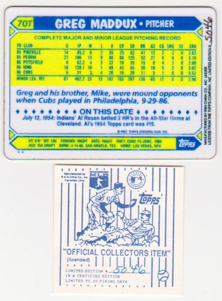 This is a 1987 Topps Traded Greg Maddux #70T porcelain rookie card.  This is a limited edition serial numbered piece.  It is hand numbered on the back of the card.  This is not a cardboard card.  It is a porcelain card that was produced in very low quantities and is in close to new condition.