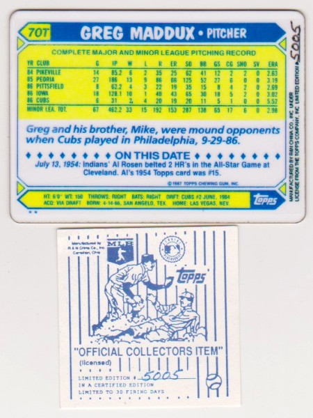 This is a 1987 Topps Traded Greg Maddux #70T porcelain rookie card.  This is a limited edition serial numbered piece.  It is hand numbered on the back of the card.  This is not a cardboard card.  It is a porcelain card that was produced in very low quantities and is in like new condition.