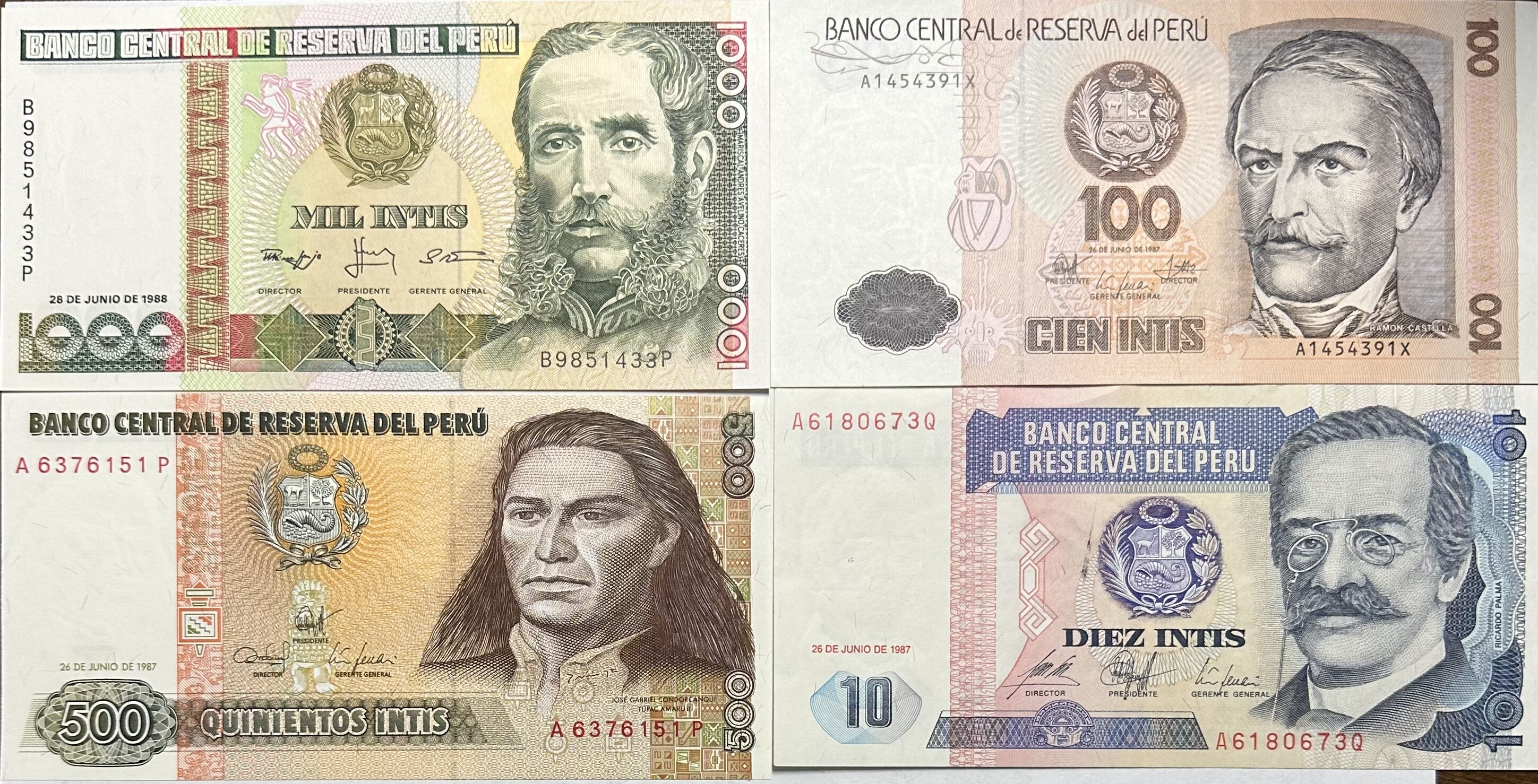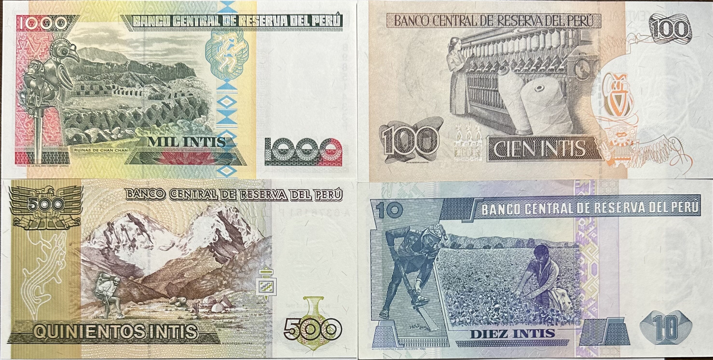 1987-1988 Peru Paper Currency - 1000, 500, 100 and 10 VERY CRISP and Colorful Intis Banknotes - 4 Notes