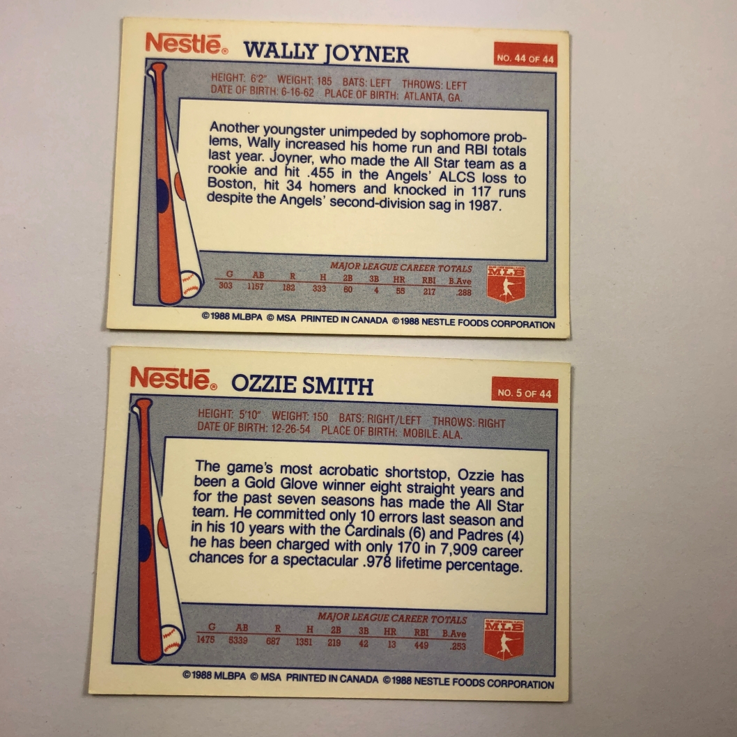 1988 OZZIE SMITH; Cardinals and WALLY JOYNER; Angels Baseball Trading Cards*Red Sox