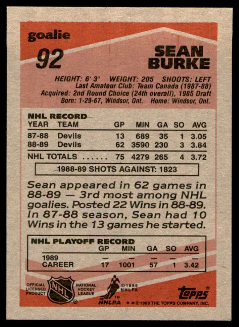 1989-90 Topps Sean Burke New Jersey Devils #92