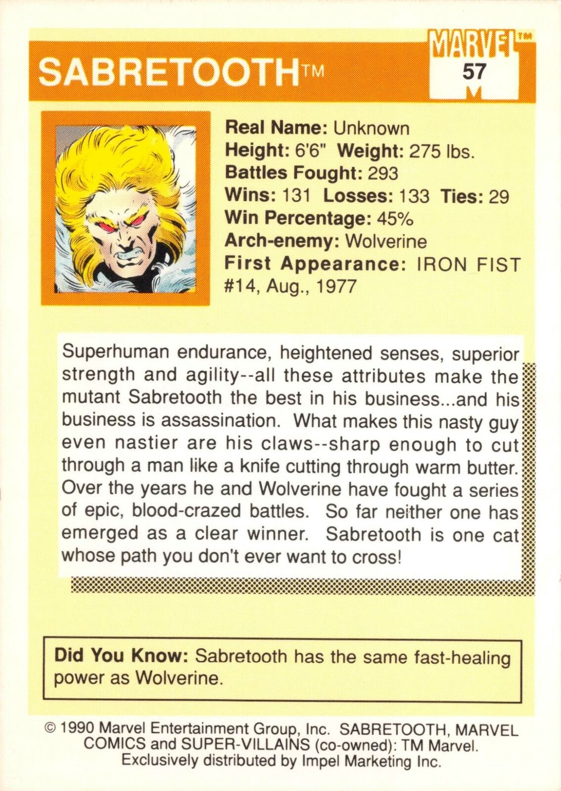 1990 Impel Marvel Universe Series 1 Super-Villains SABRETOOTH #57