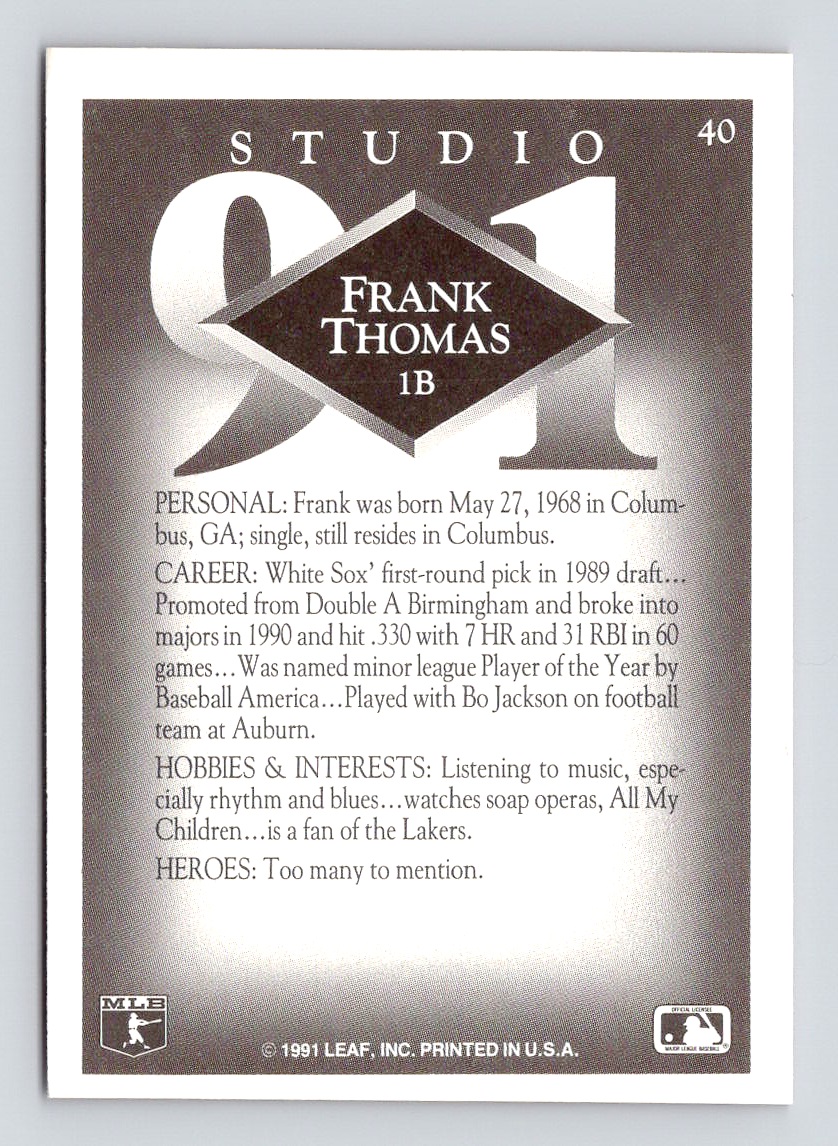1991 Leaf Studio #40 Frank Thomas Chicago White Sox Raw Vintage HOF Trading Card