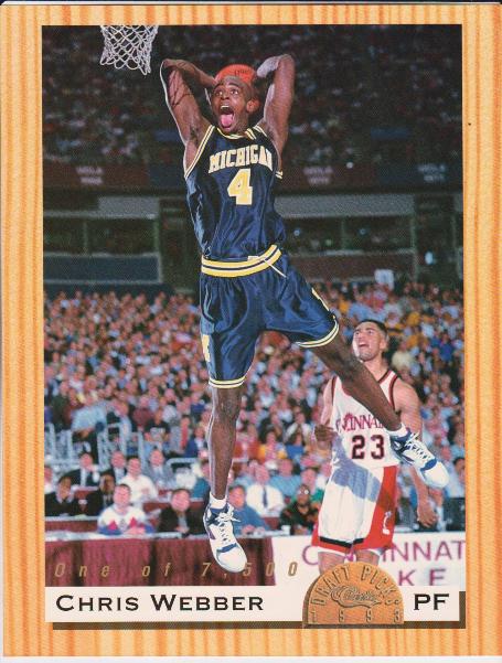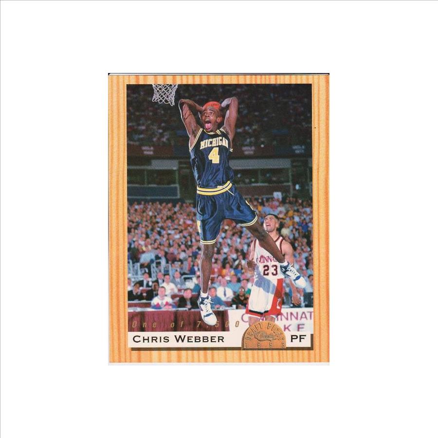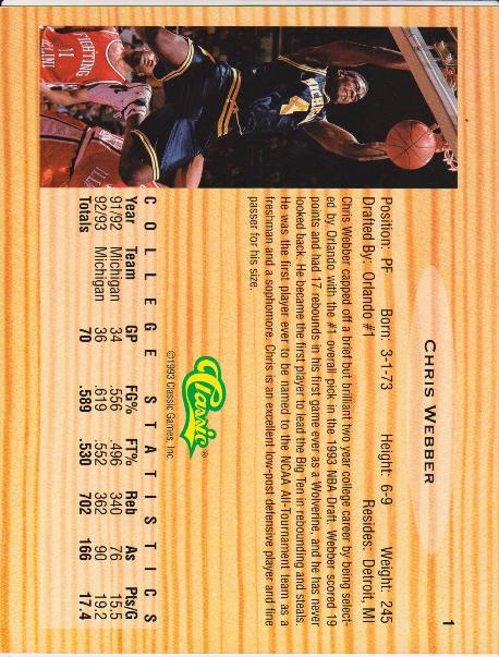 This is a 1993 Classic Chris Webber #1 8.5"x11" rookie blowup card.  This was limited to only 7,500 produced.  It is in approximately EX condition.  It has a little corner/edge wear but overall displays pretty well.