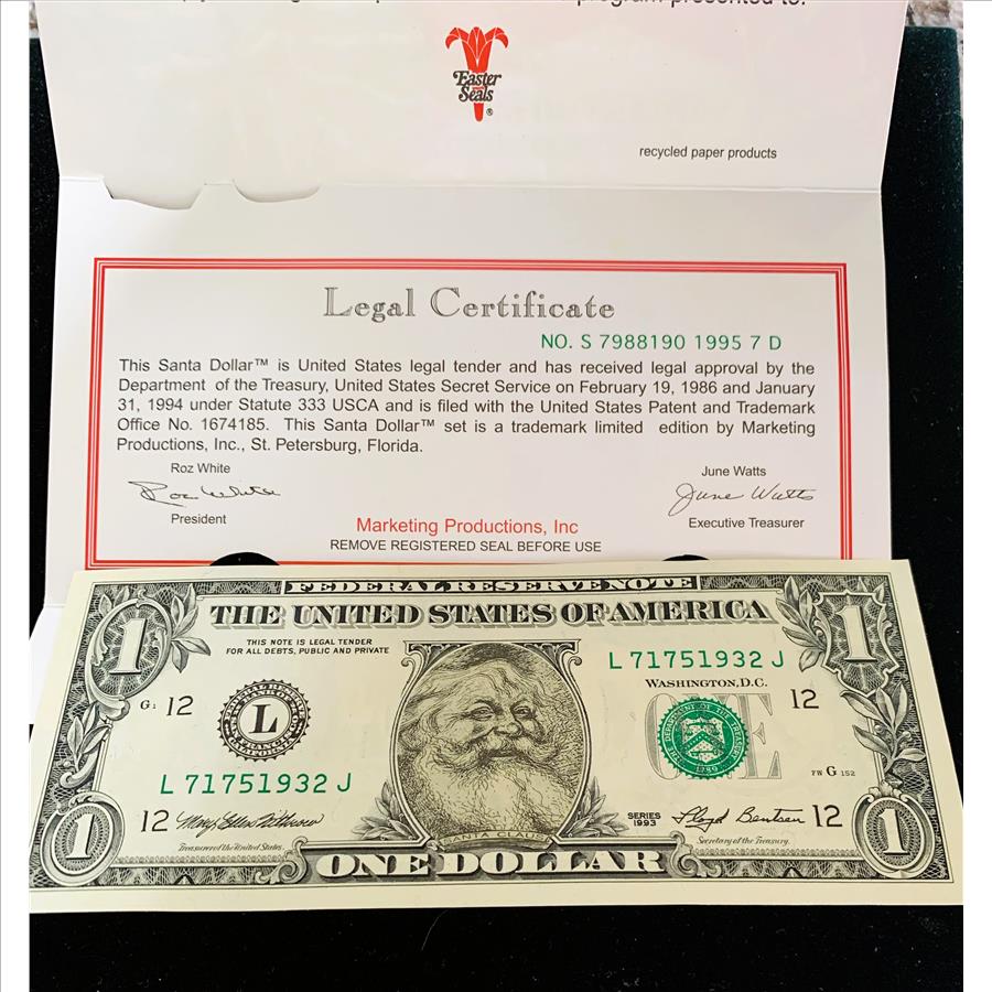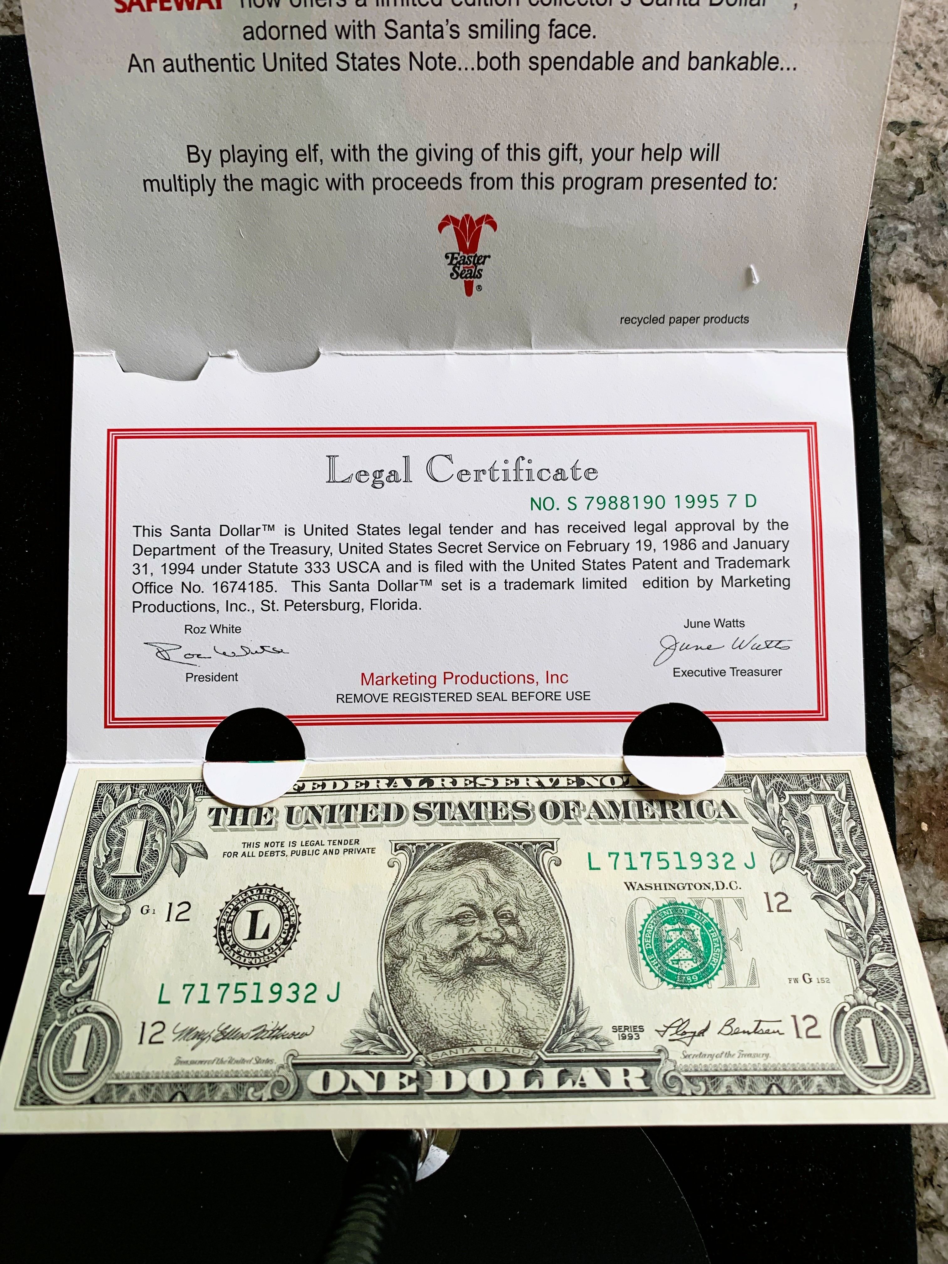 1993 RARE "SANTA" DOLLAR BILL "SAFEWAY" AUTHENTIC US NOTE, SPENDABLE AND BANKABLE, CRISP LIKE NEW IN ORIG HOLDER