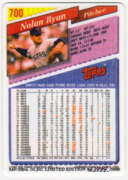 1993 Topps Nolan Ryan #700 Porcelain Card - #ed/5000 Produced