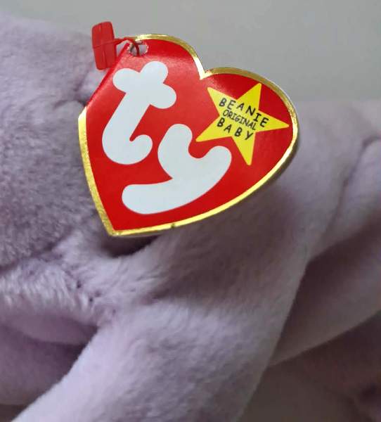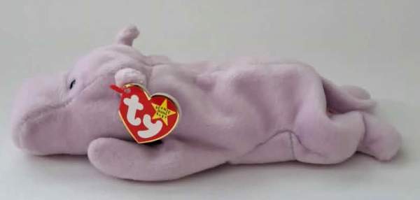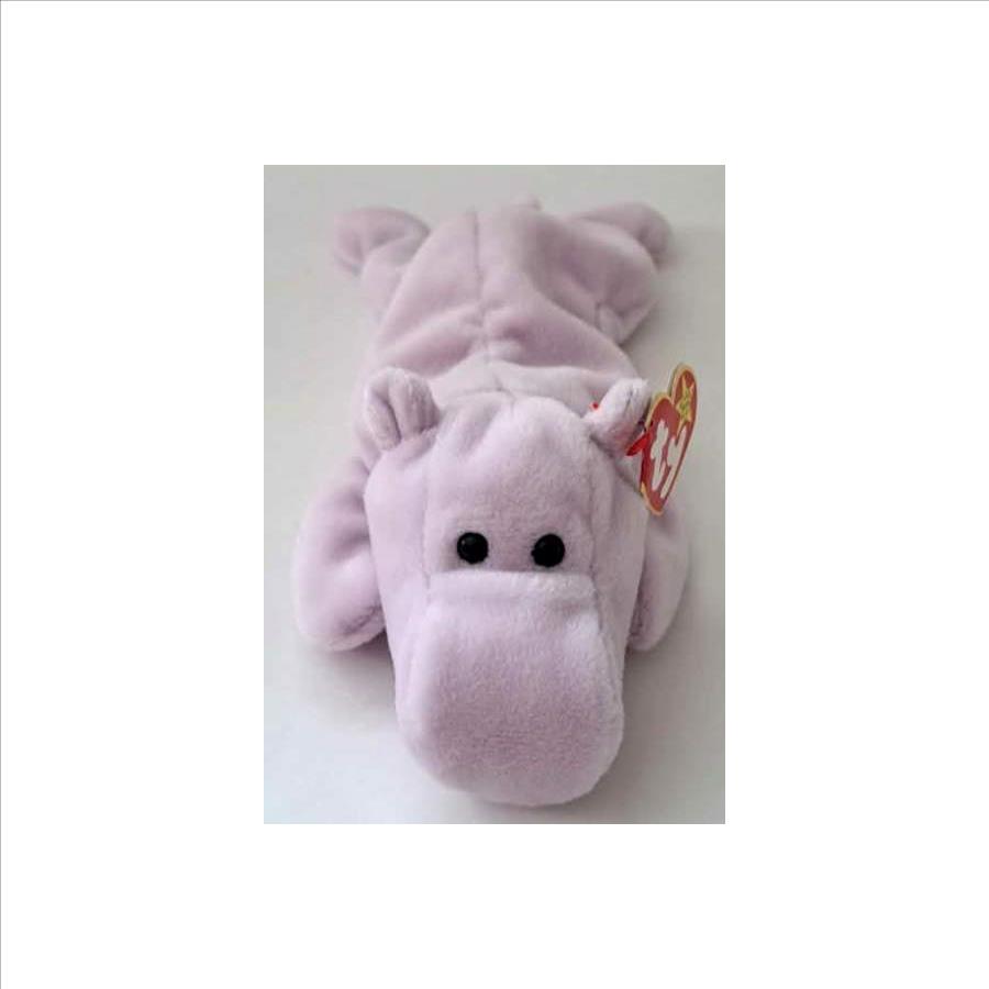 This is a 1993 Happy The Hippo Ty Beanie Baby.  It has the original tags still attached.  The swing tag has a light bend/crease, but this one is otherwise in Excellent overall condition.