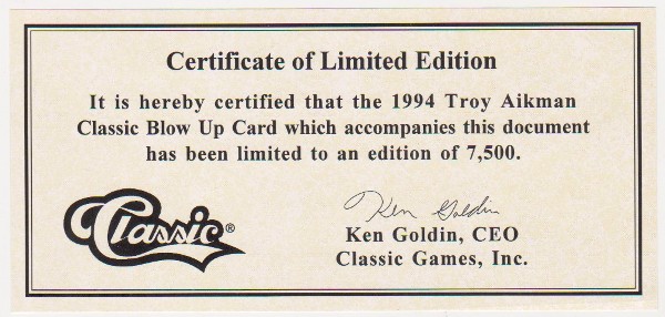 This is a 1994 Classic NFL Experience Troy Aikman 8.5 x 11 blowup.  Only 7500 of this piece was produced.  This one is in approximately VG-EX to EX condition. It has some small light surface indentations, but overall is a nice looking Aikman blowup.