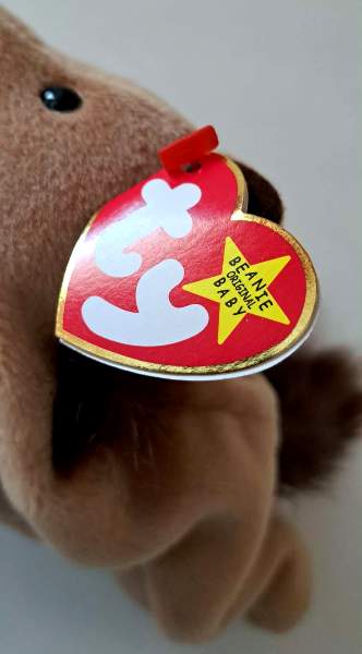 This is a 1995 Ty Derby The Horse Beanie Baby.  It has the original tags still attached. This is the fine mane and tail version, with the white spot on the head. The swing tag has a light crease, but this one is otherwise in Excellent overall condition.