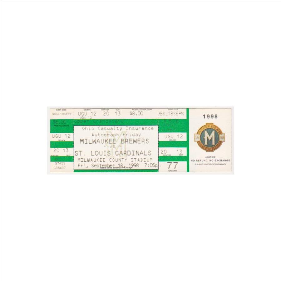 This is an original baseball ticket from September 18, 1998. This was for the St. Louis Cardinals vs. Milwaukee Brewers game. Mark McGwire hit his 64th home run in this game. This authentic ticket has light surface wear, but was never used and has not been torn. The games from that year were mostly sellouts due to the frenzy over McGwire's quest to break the all time single season home run record so most of these tickets that are out there have been torn from being used to enter the game.  Very few of these exist that weren't used for admission and this is a great piece of history as it was part of McGwire's incredible season in which he bested Roger Maris's single season home run record.