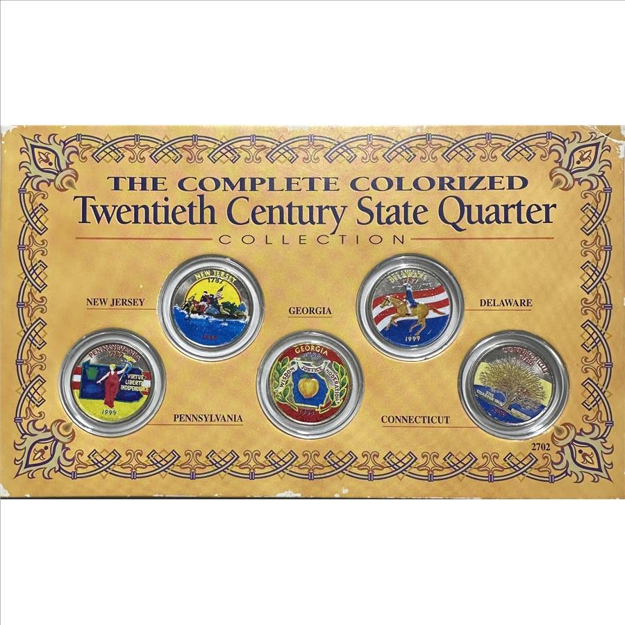 1999 Colorized Twentieth Century State Quarter Collection - NJ, DE, PA, GA and CT - 5 Colorful Quarters in Custom Display Panel