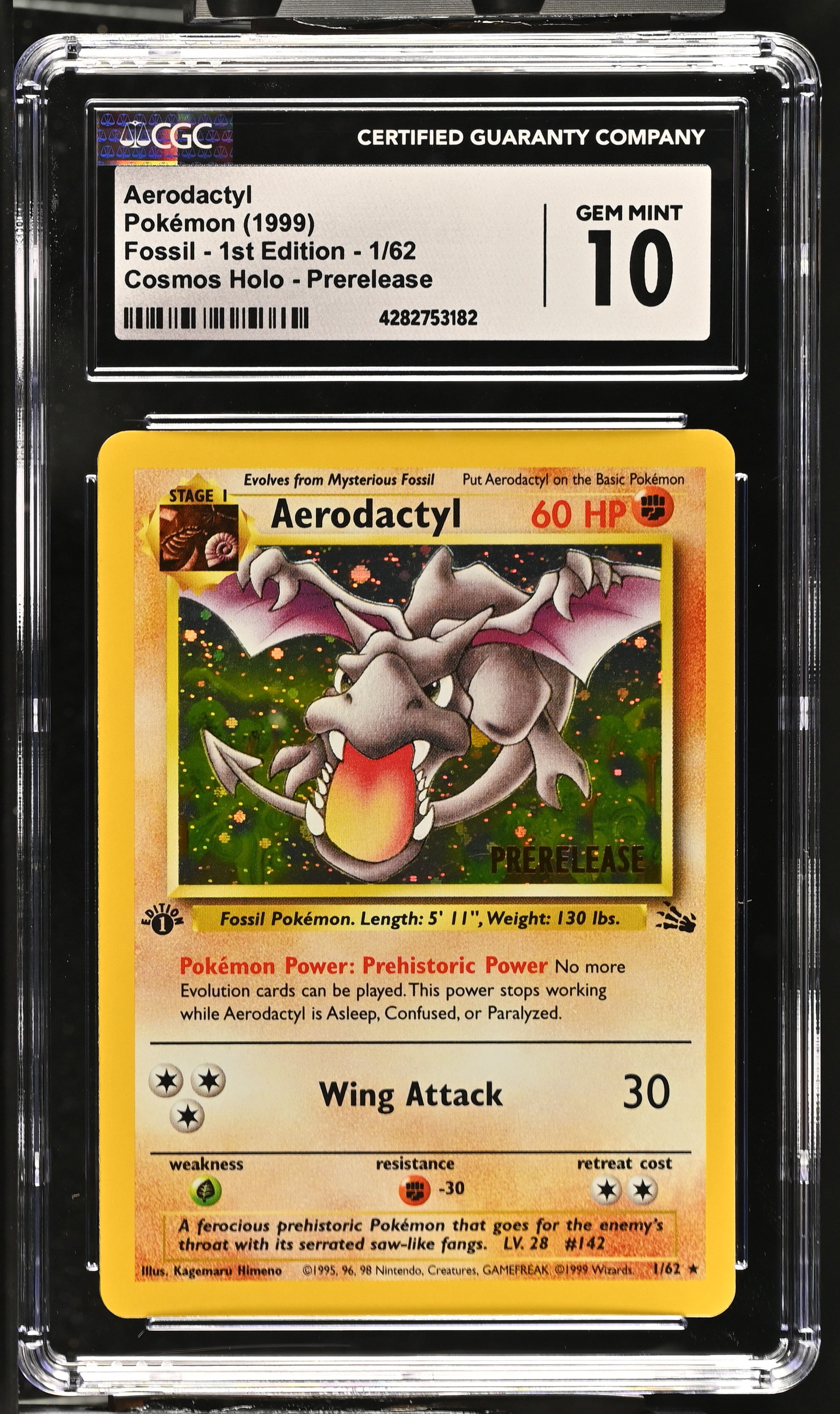 1999 Pokemon AERODACTYL #1 1ST EDITION PRERELEASE (GOLD STAMP) - Fossil - COSMOS HOLO - CGC GEM MINT 10 - Price Guide $1,185 - Reserve is 50% less than that price!