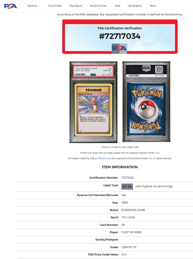 1999 Pokemon Base Set - Gust of Wind #93 - PSA GEM Mint 10 - PSA Price Guide $60.00