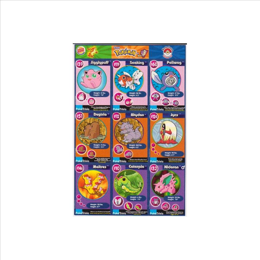This is an original 1999 Burger King Pokemon Master Trainer Collector Set Uncut Sheet.  This is sheet #20 from the set that has Jigglypuff #39, Seaking #119, Poliwag #60, Dugtrio #51, Rhydon #112, Jynx #124, Moltres #146, Caterpie #10 and nidoran #32.  It has some corner/edge wear, but the sheet is in approximately Very Good to Excellent overall condition.  This is an original vintage sheet of 1999 Pokemon cards.