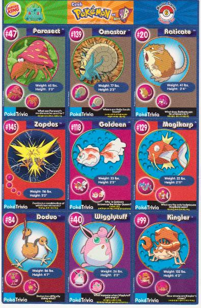 This is an original 1999 Burger King Pokemon Master Trainer Collector Set Uncut Sheet.  This is sheet #6 from the set that has Parasect #47, Zapdos #145, Doduo #84, Omastar #139, Goldeen #118, Willlytuff #40, Raticate #20, Magikarp #129 and Kingler #99.  The sheet has some wear including a crease on the bottom left portion of the Doduo card, but is otherwise in approximately Excellent condition.  This is an original vintage sheet of 1999 Pokemon cards.