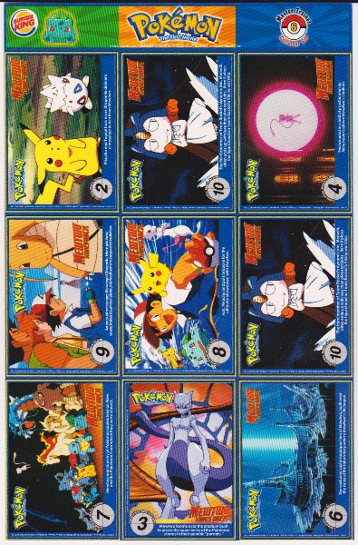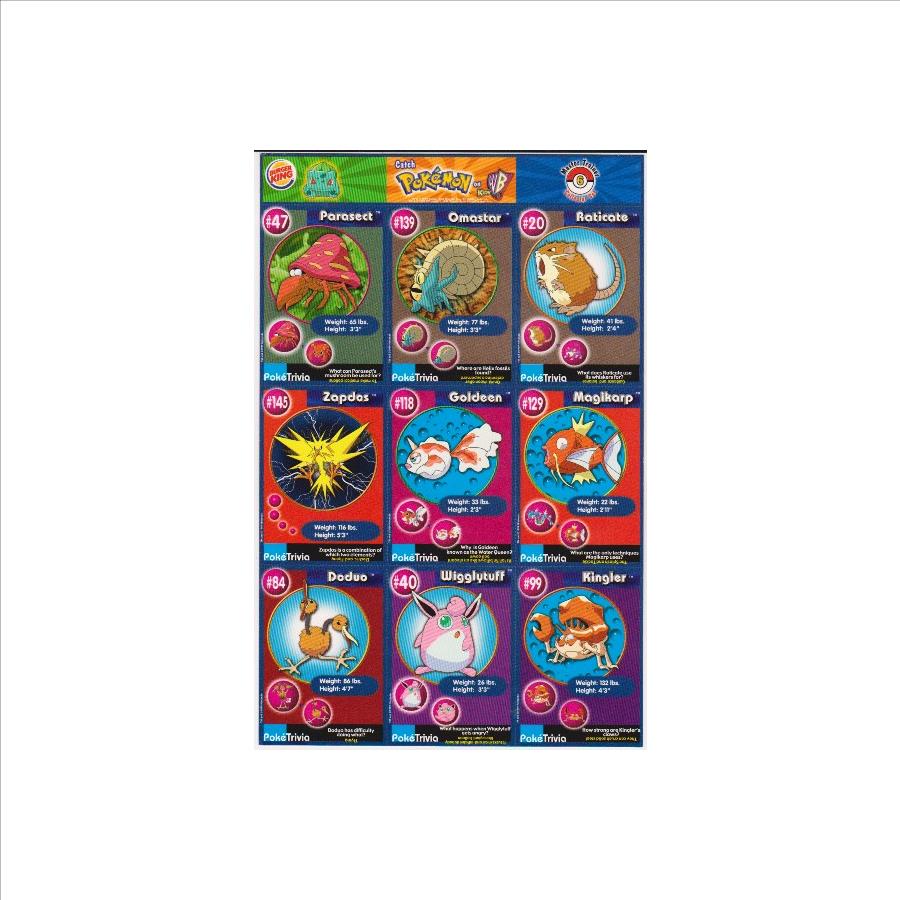 This is an authentic 1999 Burger King Pokemon Master Trainer Collector Set Uncut Sheet.  This is sheet #6 from the set that has Parasect #47, Zapdos #145, Doduo #84, Omastar #139, Goldeen #118, Willlytuff #40, Raticate #20, Magikarp #129 and Kingler #99.  The Doduo card has a light crease on the left edge, but the sheet is in approximately Very Good or better overall condition.  This is an original vintage sheet of 1999 Pokemon cards.