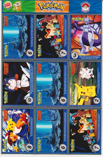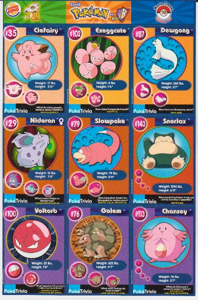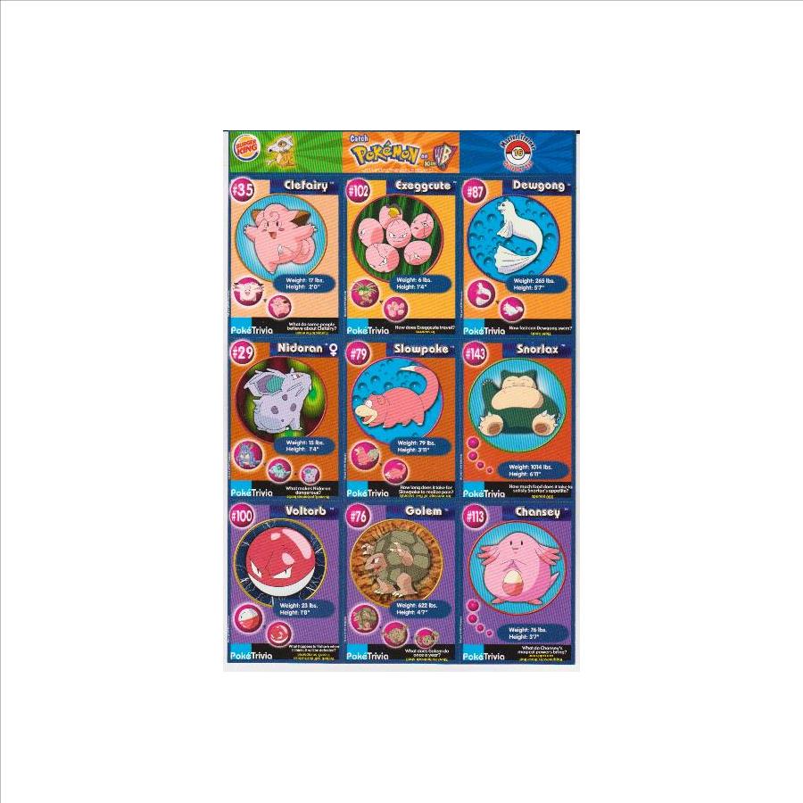 This is an original 1999 Burger King Pokemon Master Trainer Collector Set Uncut Sheet.  This is sheet #16 from the set that has Clefairy #35, Exeggcute #102, Dewgong #87, Nidoran #29, Slowpoke #79, Snorlax #143, Voltorb #100, Golen #76 and Chansey #113.  The sheet has a little corner wear, but is in approximately Excellent overall condition.  This is an original vintage sheet of 1999 Pokemon cards.