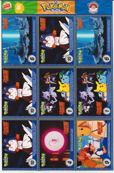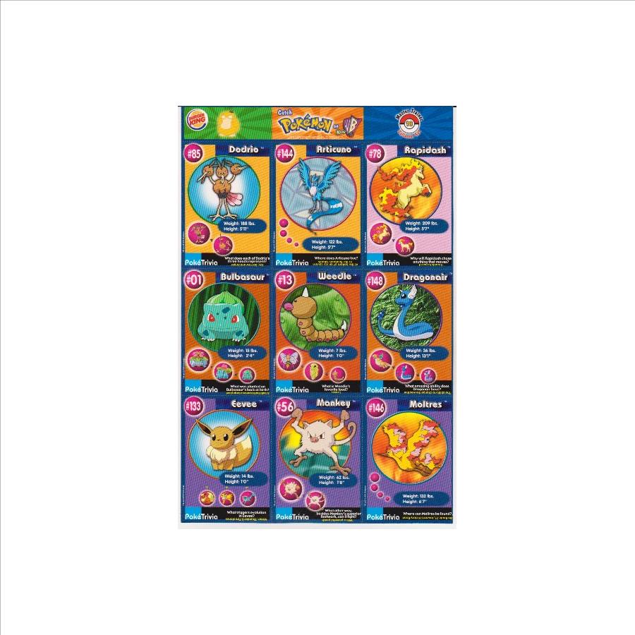 This is an authentic 1999 Burger King Pokemon Master Trainer Collector Set Uncut Sheet.  This is sheet #18 from the set that has Dodrio #85, Bulbasaur #01, Eevee #133, Articuno #144, Weedle #13, Mankey #56, Rapidash #78, Dragonair #148 and Moltres #146.  There is a ding on the bottom left corner of the Eevee card, but the sheet is otherwise in approximately Excellent overall condition. This is an original vintage sheet of 1999 Pokemon cards.