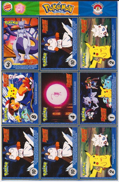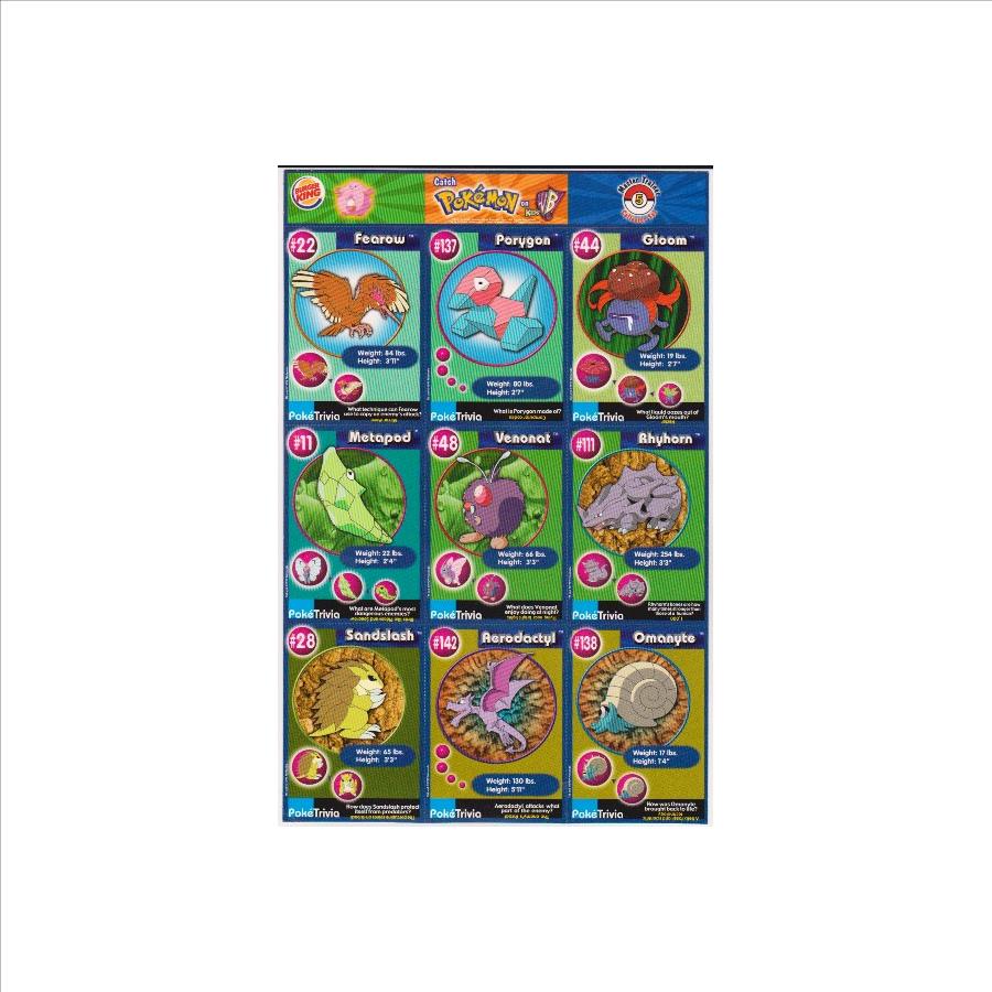 This is an original 1999 Burger King Pokemon Master Trainer Collector Set Uncut Sheet.  This is sheet #5 from the set that has Fearow #22, Porygon #137, Gloom #44, Metapod#11, Venonat #48, Rhyhorn #111, Sandslash #28, Aerodactyl #142 and Omanyte #138.  The Sandslash card has a crease on the bottom left corner, but the sheet is otherwise in approximately Excellent overall condition.  This is an original vintage sheet of 1999 Pokemon cards.
