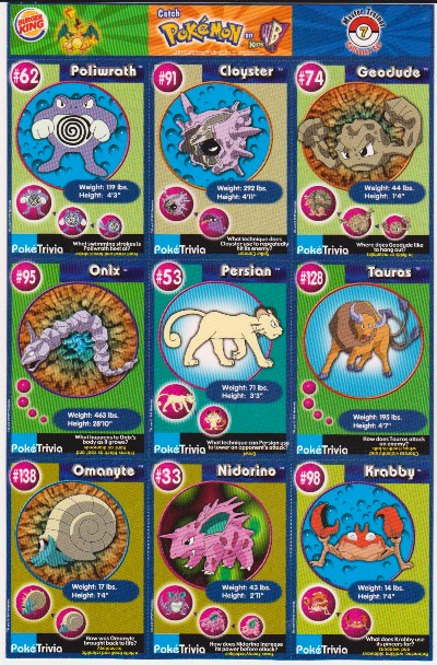 This is an original 1999 Burger King Pokemon Master Trainer Collector Set Uncut Sheet.  This is sheet #7 from the set that has Poliwrath #62, Cloyster #91, Geodude #74, Onix #95, Persian #53, Tauros #128, Omanyte #138, Nidorino #33 and Krabby #98.  The sheet has minor wear, but is in approximately Excellent overall condition. This is an original vintage sheet of 1999 Pokemon cards.