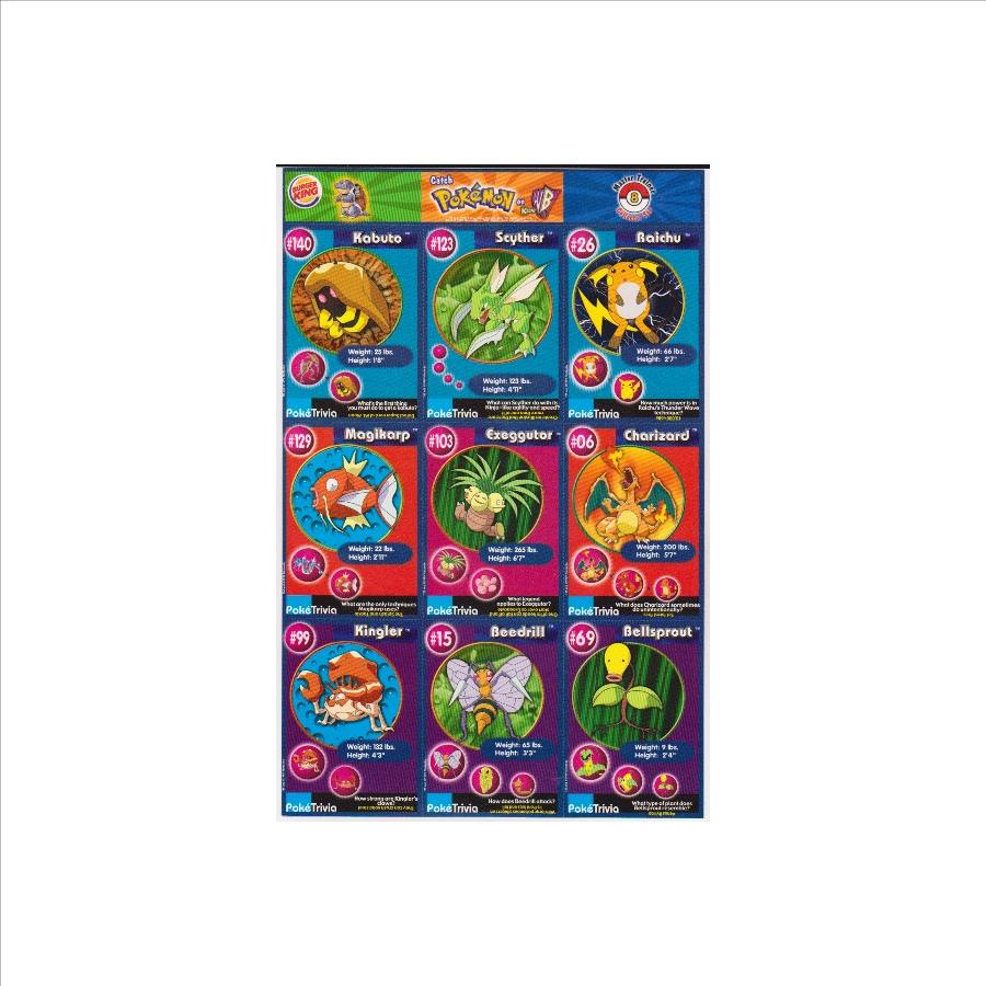 This is an original 1999 Burger King Pokemon Master Trainer Collector Set Uncut Sheet.  This is sheet #8 from the set that has Kabuto #140, Scyther #123, Raichu #26, Magikarp #129, Exeggutor #103, Charizard #6, Kingler #99, Beedrill #15 and Bellsprout #69.  There is a small ding/surface crease on the bottom left portion of the Kingler card. Otherwise the sheet, including the Charizard card, is in Excellent condition. This is an original vintage sheet of 1999 Pokemon cards.