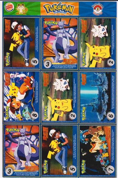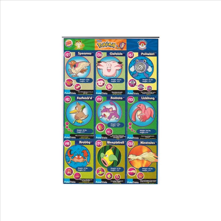 This is an original 1999 Burger King Pokemon Master Trainer Collector Set Uncut Sheet.  This is sheet #9 from the set that has Spearow #21, Clefable #36, Poliwhirl #61, Farfetch'd #83, Rattata #19, Lickitung #108, Krabby #98, Weepinbell #70 and Ninetales #38.  This one has some corner/edge/surface wear, but the sheet is in approximately Very Good or better overall condition.  This is an original vintage sheet of 1999 Pokemon cards.