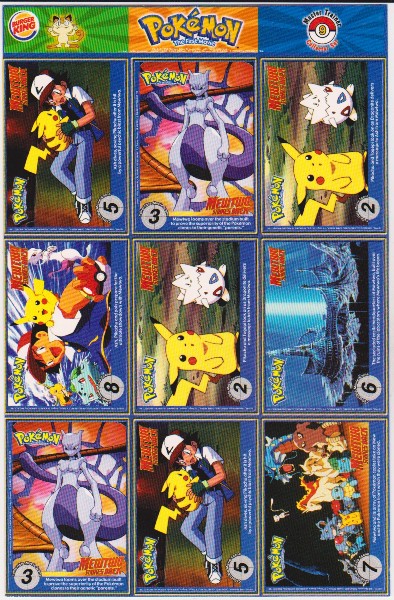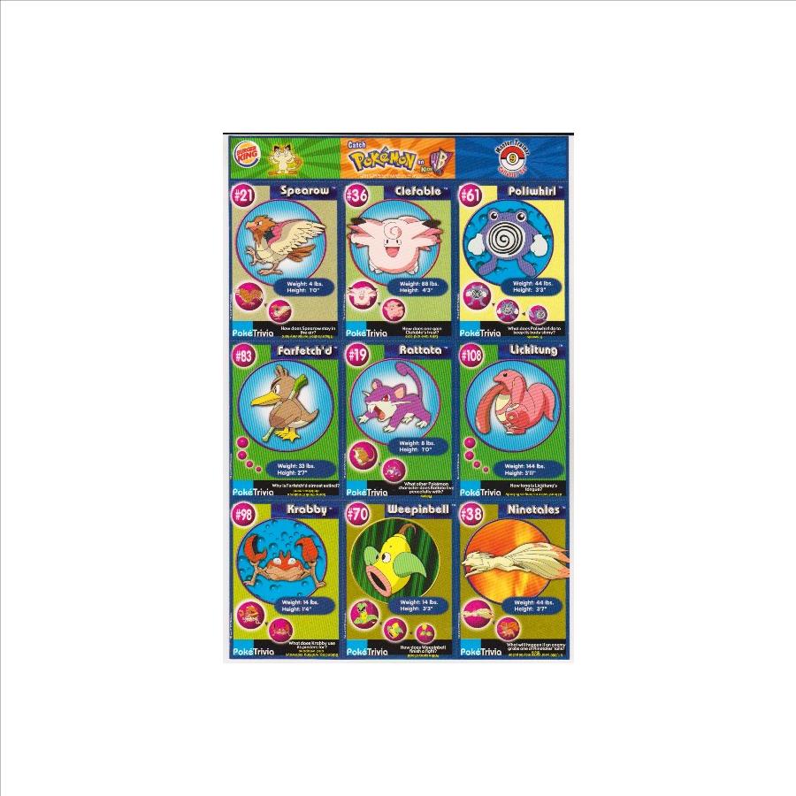 This is an original 1999 Burger King Pokemon Master Trainer Collector Set Uncut Sheet.  This is sheet #9 from the set that has Spearow #21, Clefable #36, Poliwhirl #61, Farfetch'd #83, Rattata #19, Lickitung #108, Krabby #98, Weepinbell #70 and Ninetales #38.  There is a small edge hit on the left edge of the Krabby and Spearow cards, but the sheet is otherwise in approximately Excellent overall condition.  This is an original vintage sheet of 1999 Pokemon cards.