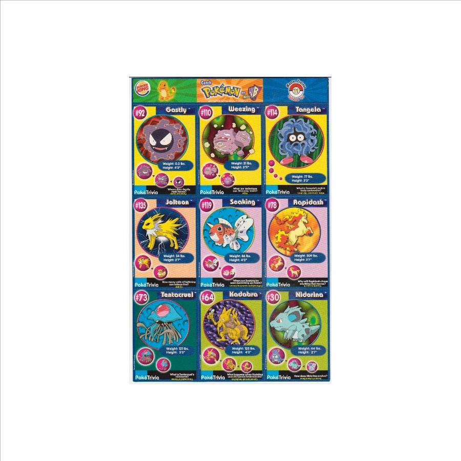 This is an authentic 1999 Burger King Pokemon Master Trainer Collector Set Uncut Sheet.  This is sheet #11 from the set that has Gastly #92, Weezing #110, Tangela #114, Jolteon #135, Seaking #119, Rapidash #78, Tentacruel #73, Kadabra #64 and Nidorina #30.  This one has wear including a ding on the bottom left corner of the Tentacruel card, but the sheet is in approximately Very Good to Excellent overall condition.  This is an original vintage sheet of 1999 Pokemon cards.