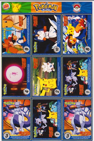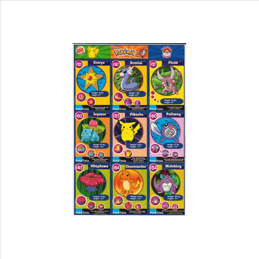 This is an original 1999 Burger King Pokemon Master Trainer Collector Set Uncut Sheet.  This is sheet #13 from the set that has Staryu #120, Ivysaur #02, Vileplume #45, Dratini #147, Pikachu #25, Charmander #04, Pinsir #127, Poliwag #60 and Nidoking #34.  There is a small crease on the top right corner of the strip above the cards, but the sheet is otherwise in approximately Excellent overall condition.  This is an original vintage sheet of 1999 Pokemon cards.