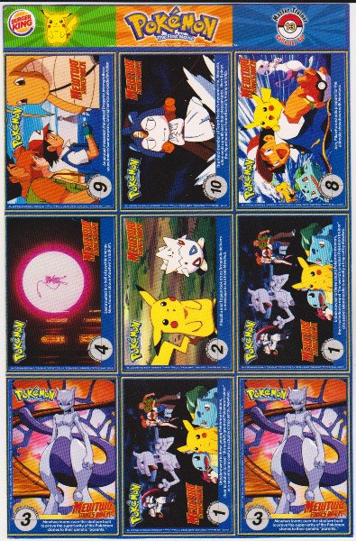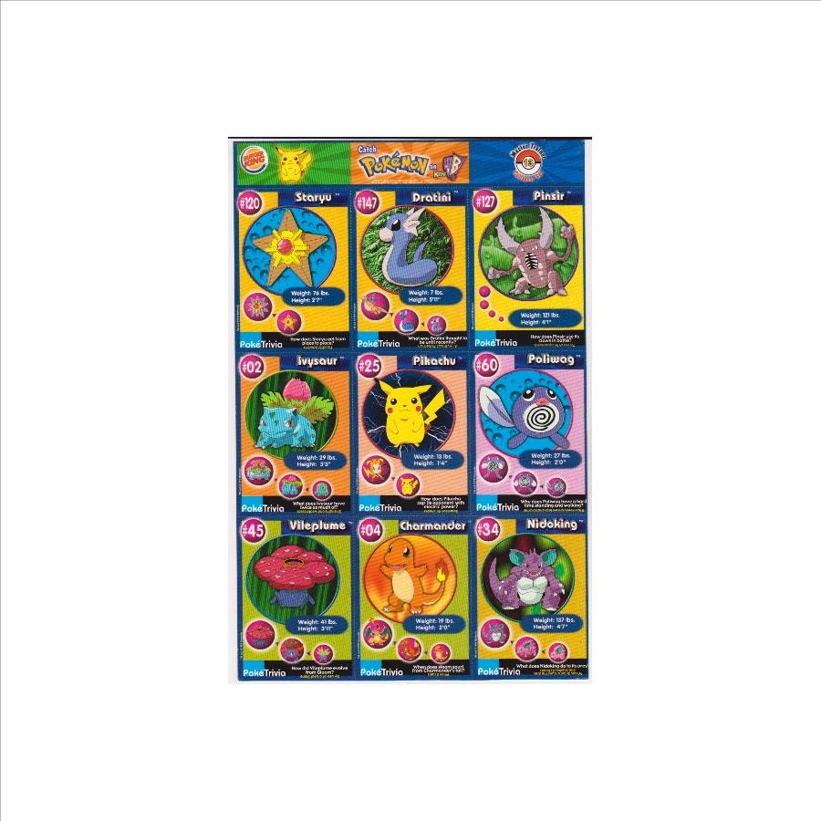 This is an original 1999 Burger King Pokemon Master Trainer Collector Set Uncut Sheet.  This is sheet #13 from the set that has Staryu #120, Ivysaur #02, Vileplume #45, Dratini #147, Pikachu #25, Charmander #04, Pinsir #127, Poliwag #60 and Nidoking #34.  It has corner/edge wear, but is in approximately Very Good or better overall condition.  This is an original vintage sheet of 1999 Pokemon cards.