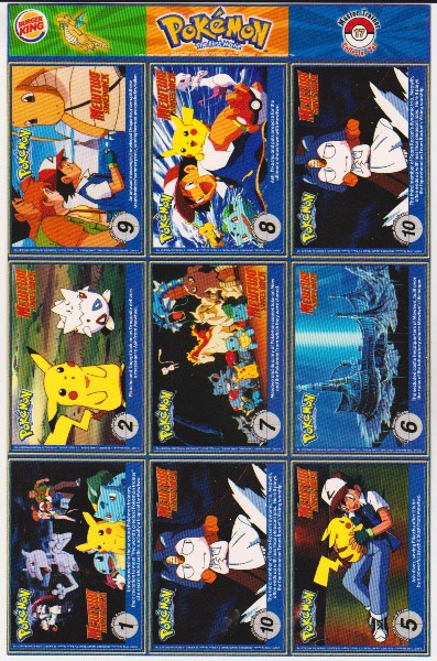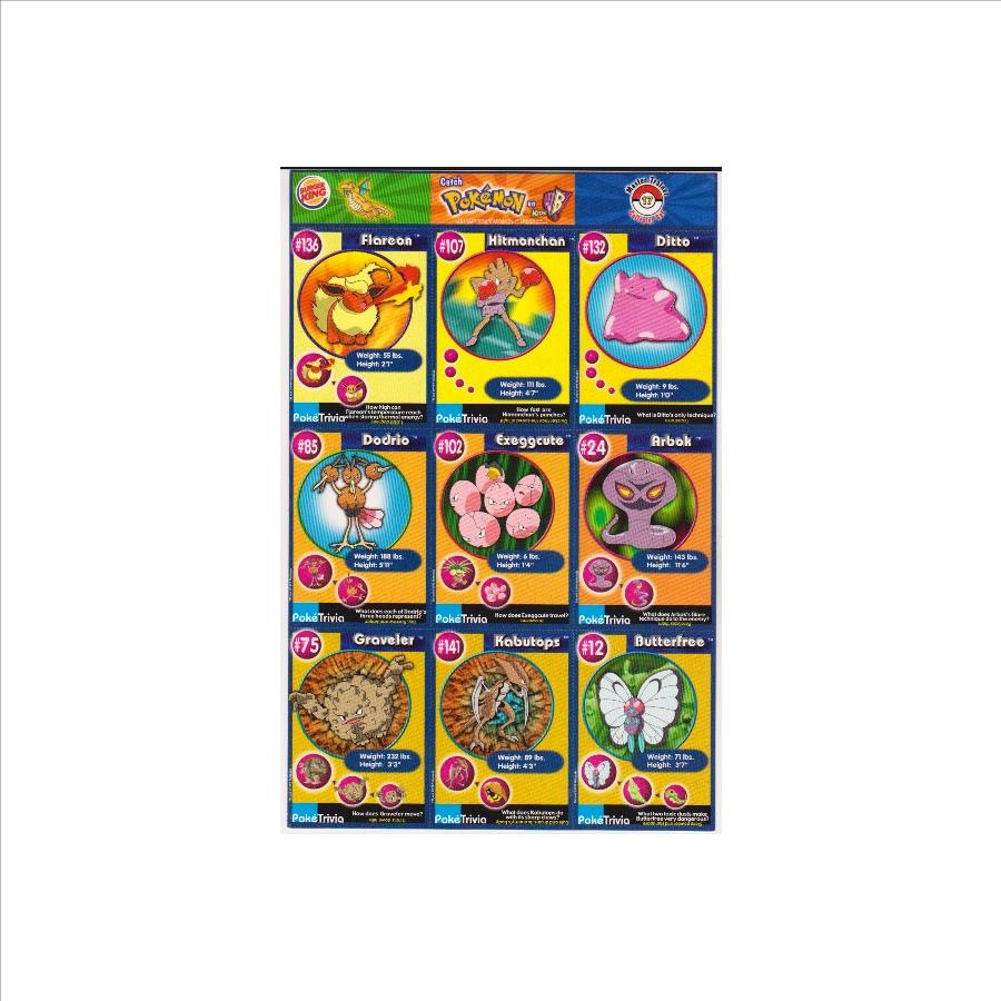 This is an original 1999 Burger King Pokemon Master Trainer Collector Set Uncut Sheet.  This is sheet #17 from the set that has Flareon #136, Dodrio #85, Graveler #75, Hitmonchan #107, Exeggcute #102, Kabutops #141, Ditto #132, Arbok #24 and Butterfree #12.  It has some wear including a small crease on the top right corner of the strip above the cards, but the sheet is otherwise in approximately Excellent overall condition.  This is an original vintage sheet of 1999 Pokemon cards.