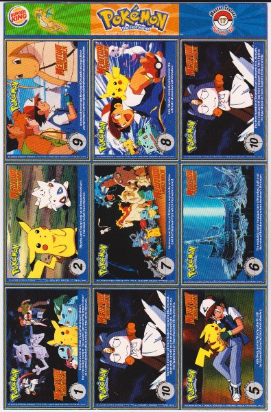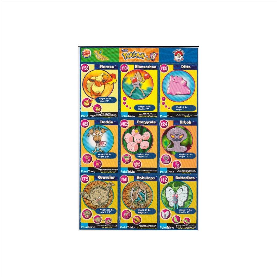 This is an original 1999 Burger King Pokemon Master Trainer Collector Set Uncut Sheet.  This is sheet #17 from the set that has Flareon #136, Dodrio #85, Graveler #75, Hitmonchan #107, Exeggcute #102, Kabutops #141, Ditto #132, Arbok #24 and Butterfree #12.  This one has some wear including a small crease on the top left corner of the strip above the cards, but the sheet is in approximately Excellent overall condition.  This is an original vintage sheet of 1999 Pokemon cards.