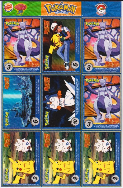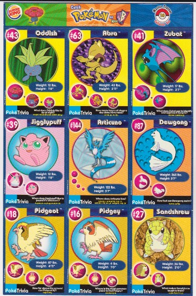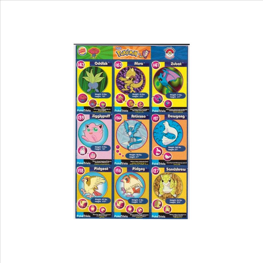 This is a 1999 Burger King Pokemon Master Trainer Collector Set Uncut Sheet.  This is sheet #19 from the set that has Oddish #43, Abra #63, Zubat #41, Jigglypuff #39, Articuno #144, Dewgong #87, Pidgeot #18, Pidgey #16 and Sandshrew #27.  It has corner/edge wear and some surface indentations on a few of the cards, but the sheet is in approximately Very Good overall condition.  This is an original vintage sheet of 1999 Pokemon cards.