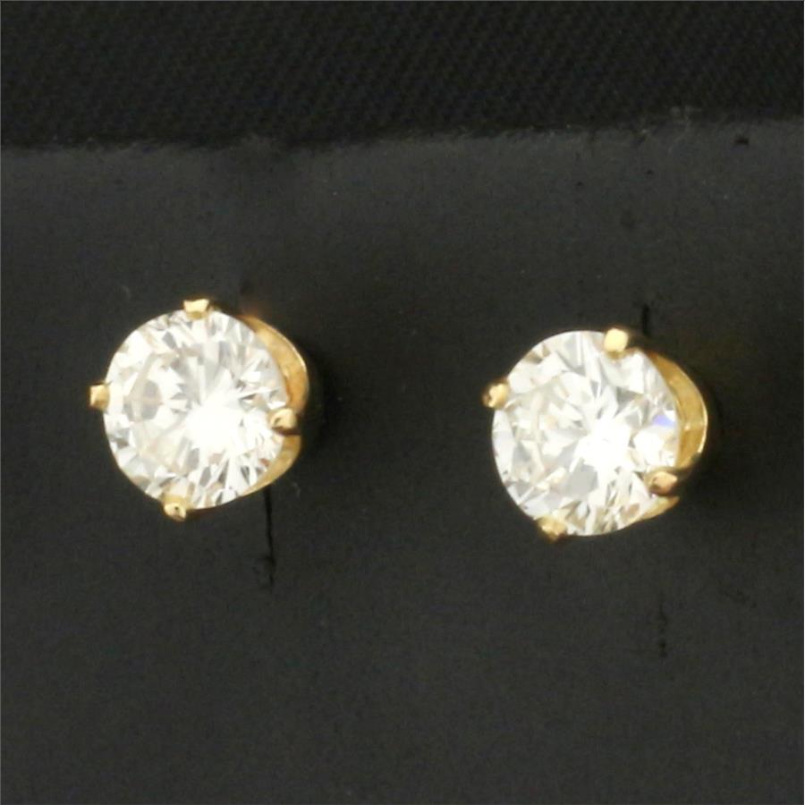 In 14K Yellow Gold. Each earring contains one high quality round brilliant 1/2ct diamond, VS clarity/G color, great cut for lots of sparkle. Basket settings with friction backs. 1.4g.