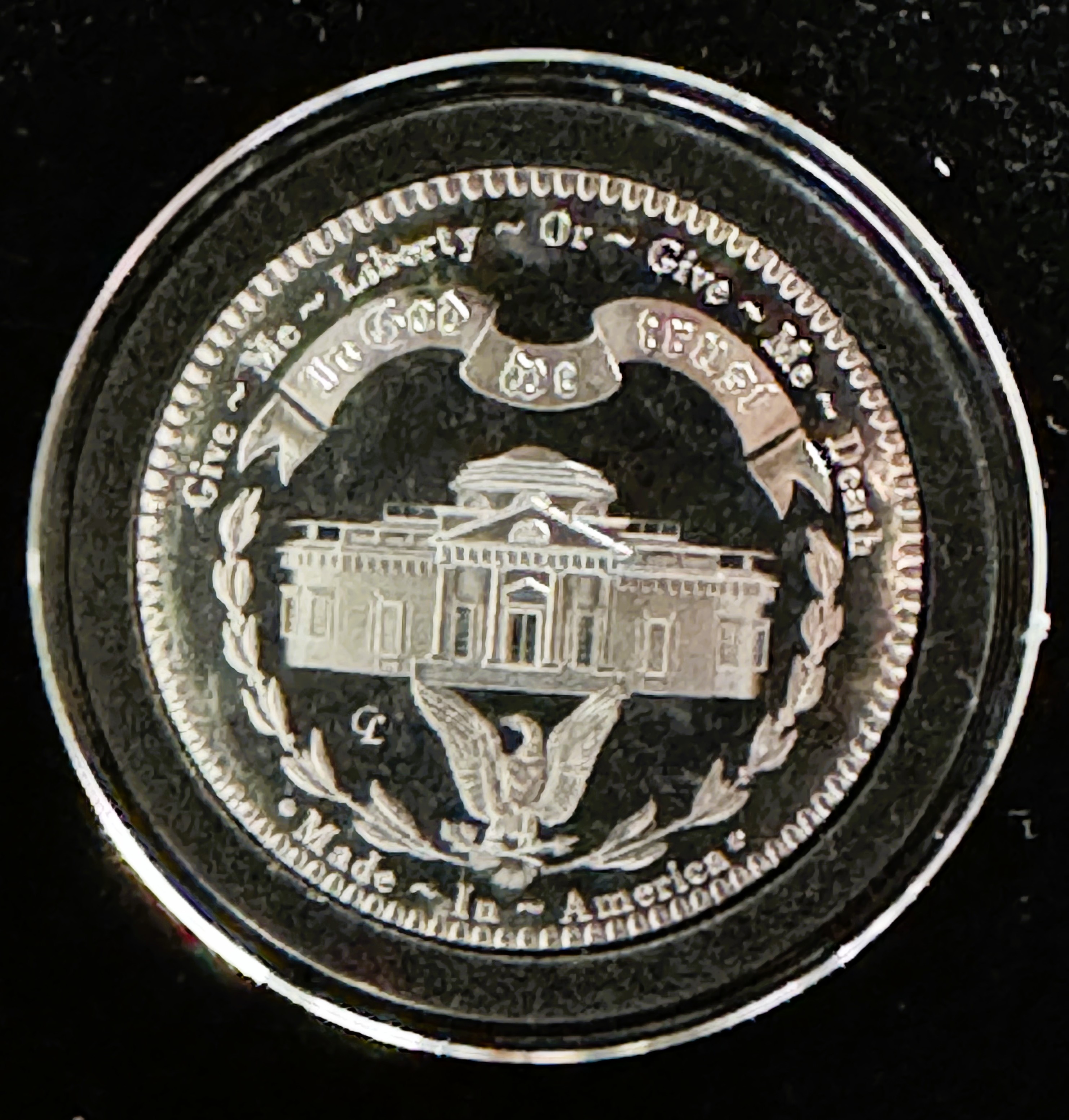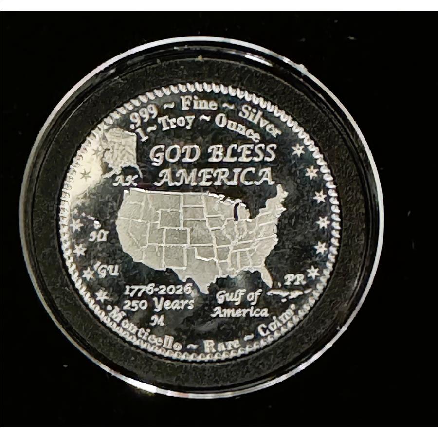 1oz .999 FINE SILVER, PROOF 250th U.S. ANNIVERSARY, RARE LOW MINTAGE, MONTICELLO DETAIL ENGRAVED MINTED COIN