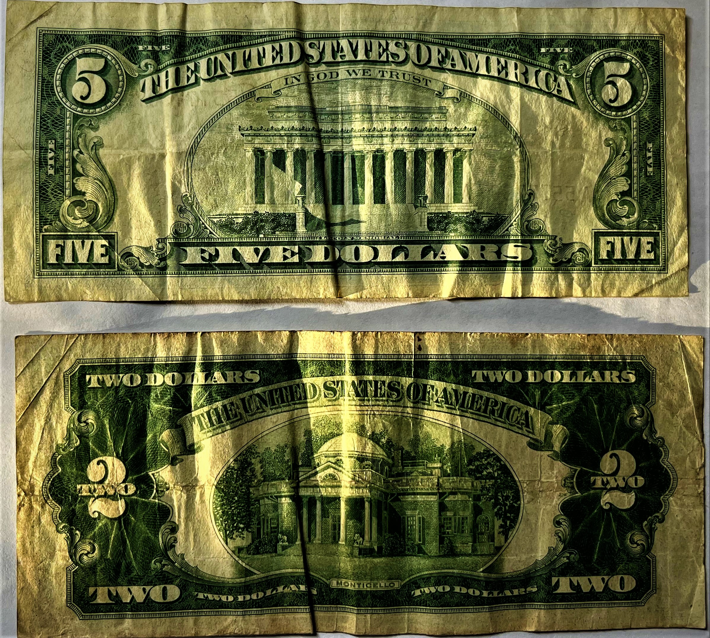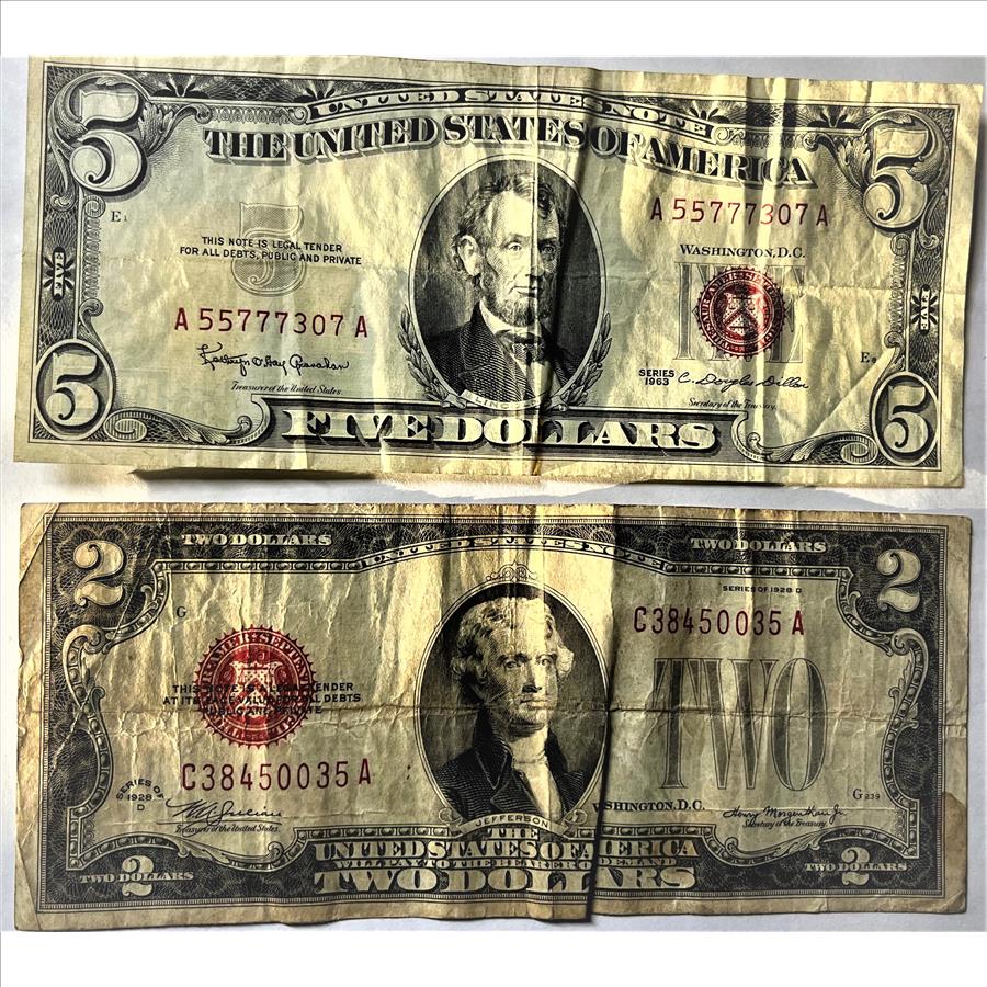 (2) Red Seal U.S. Currency Notes (1) 1928 D $2 Bill & (1) 1963 $5 Bill Scarce Obsolete Notes In Custom Bifold
