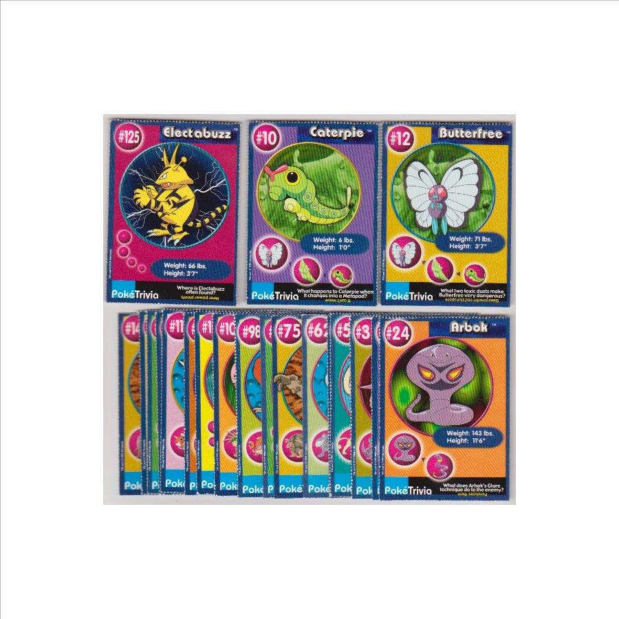 This is a collection of 20 different 1999 Pokemon Master Trainer cards from the Burger King set.  These have perforated edges as this is how they came from the sheets.  These cards do not exist without rough perforated edges unless they were trimmed or cut.  They have minor wear but the lot is mostly in Excellent condition.  See the photos for the exact condition.  This lot includes:  Electabuzz #125, Caterpie #10, Butterfree #12, Arbok #24, Nidoran #32, Nidorino #33, Persian #53, Poliwag #60, Poliwrath #62, Graveler #75, Onix #95, Krabby #98, Exeggcute #102, Hitmonchan #107, Rhydon #112, Seaking #119, Jynx #124, Tauros #128, Ditto #132, and Kabutops #141 from the set.  This is an original 27 year old Pokemon card lot.