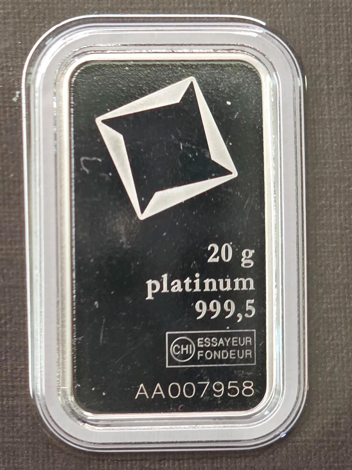 • Contains 20 grams (.643 oz) of .9995 fine Platinum. - Serial # AA007958 - You will receive the bar shown.