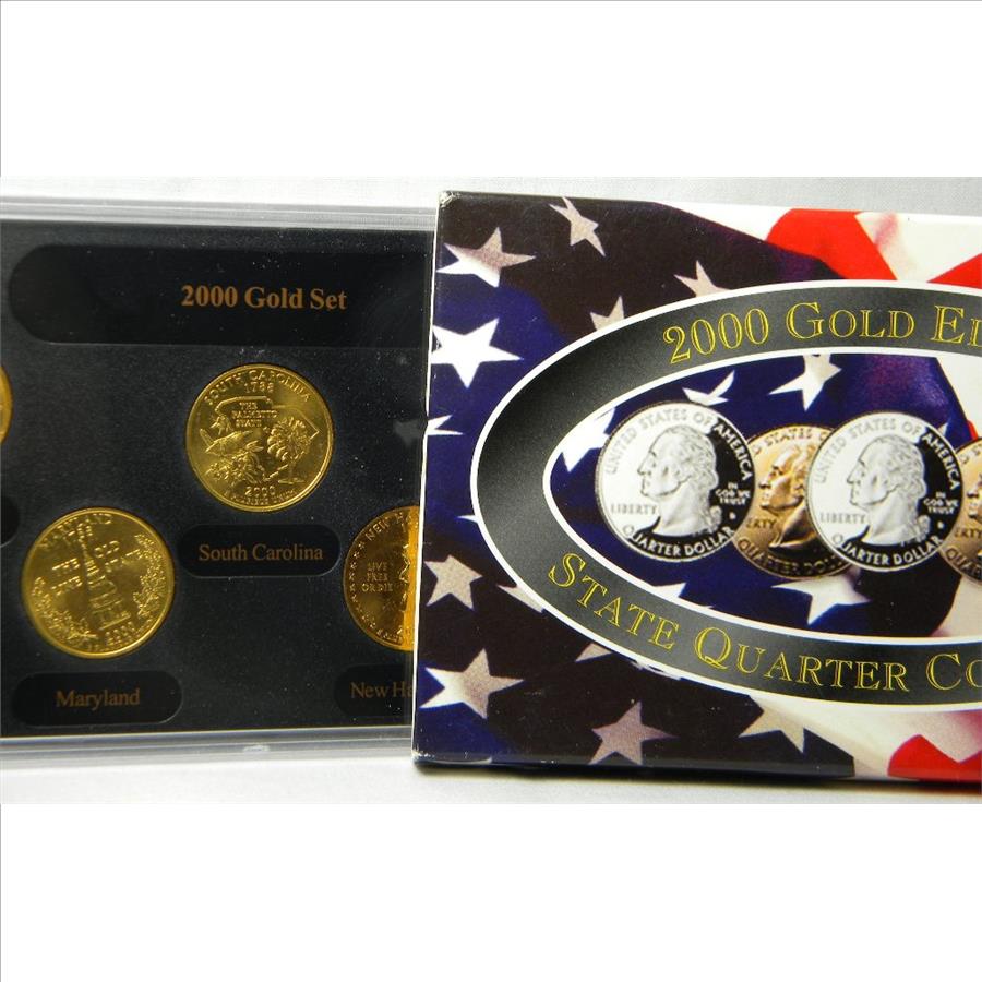 These five gold uncirculated quarters represent the states of Massachusetts, Maryland, South Carolina, New Hampshire and Virginia.  The quarters are layered in 24K gold and are encased in plastic to provide their lasting protection.  Also enclosed is the Certificate of Authenticity from the US Mint to ensure you are getting the real and quality product