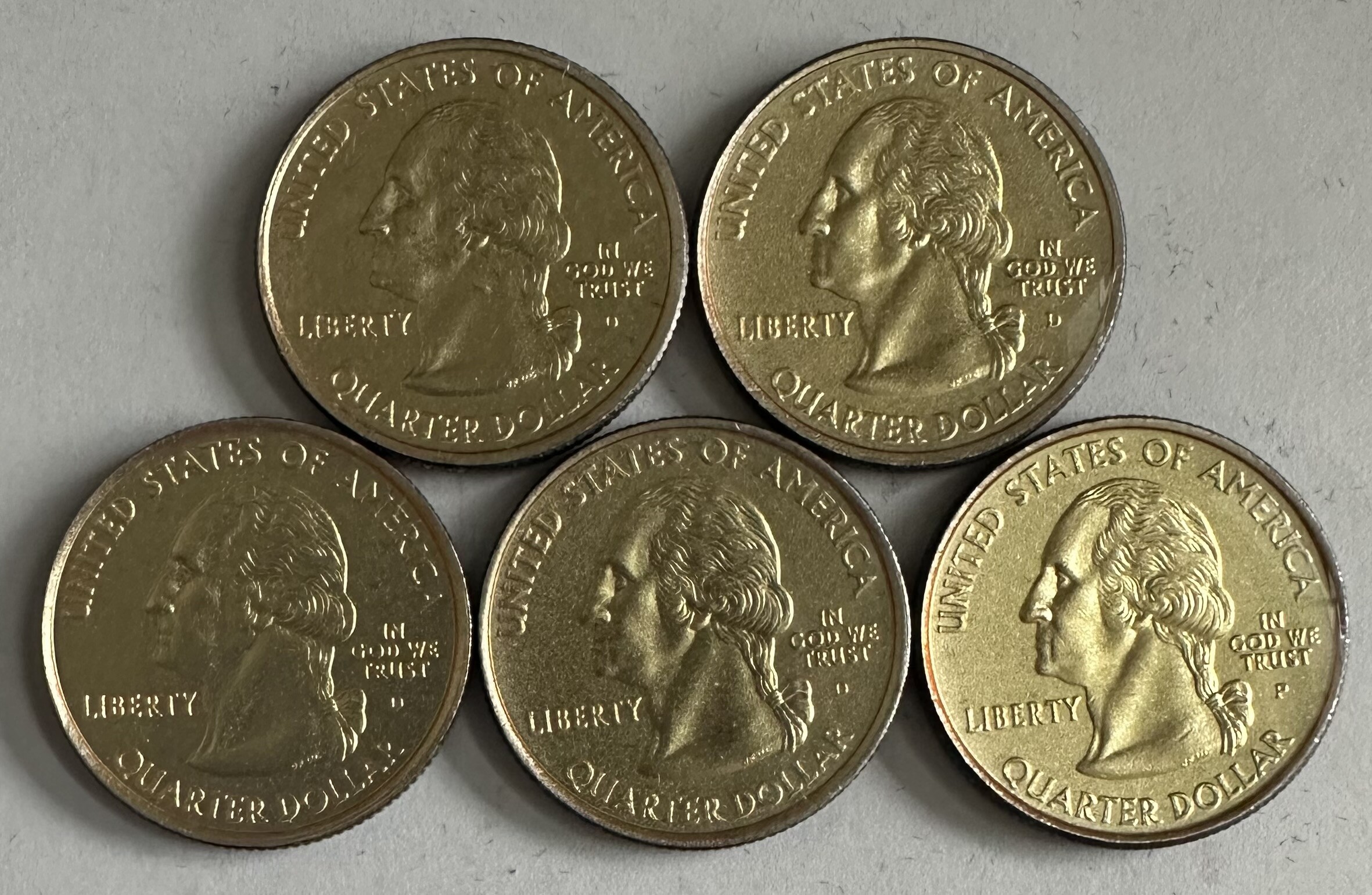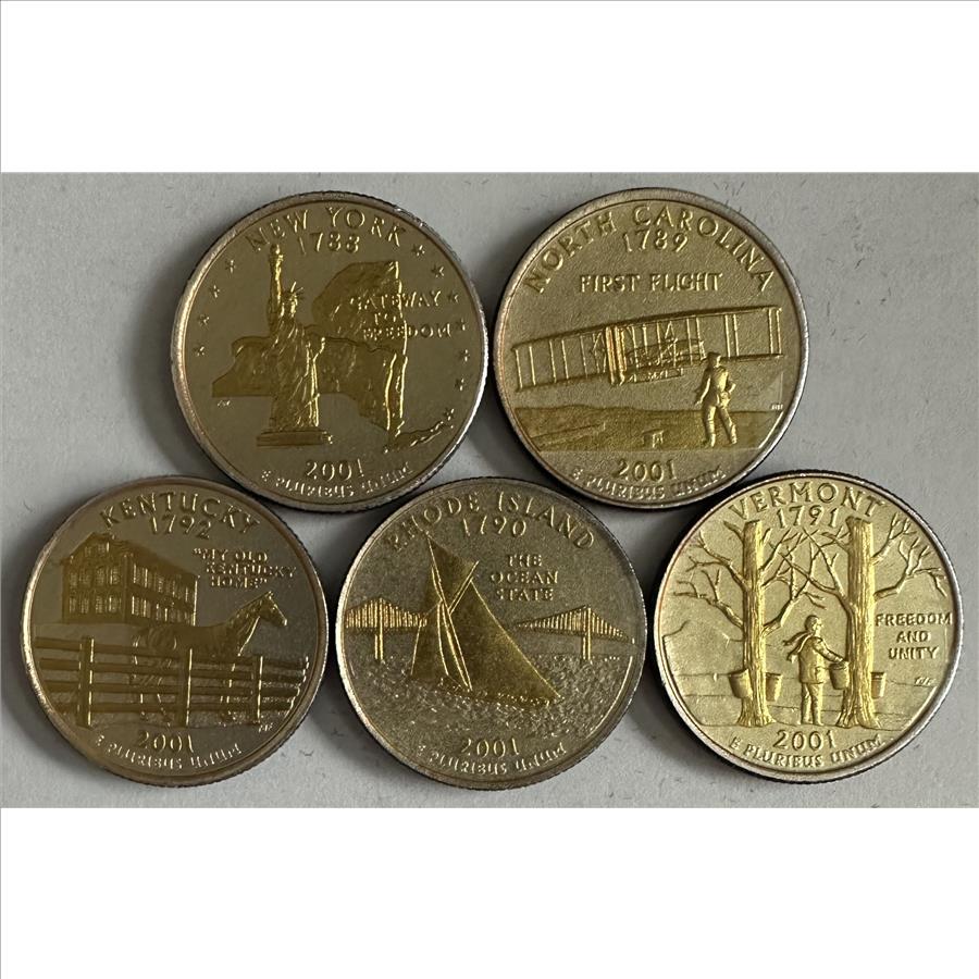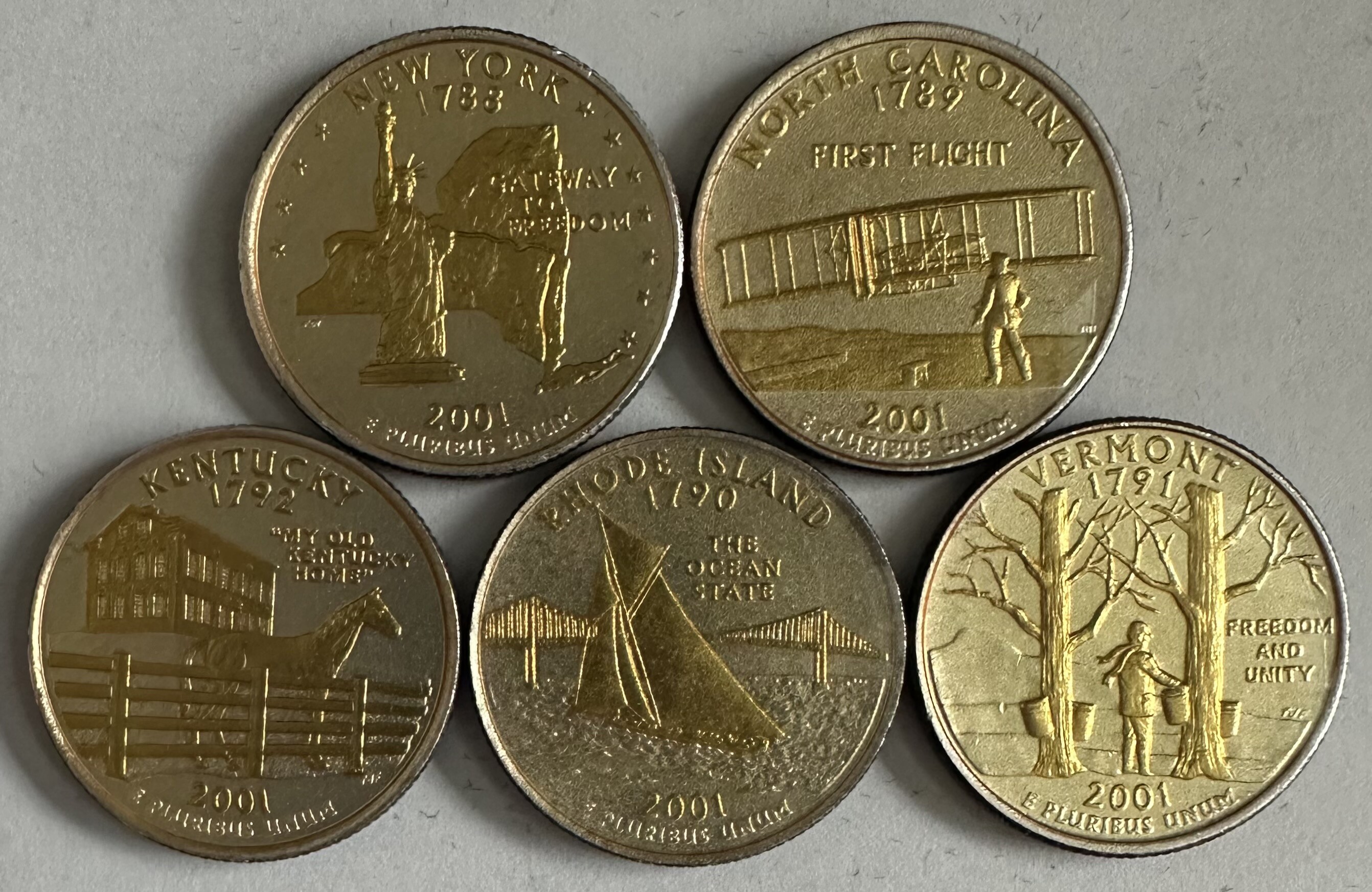 2001 U.S. Gold Layered State Quarters (D) NY, NC, KY and RI and (P) VT - 5 Beautiful Quarters