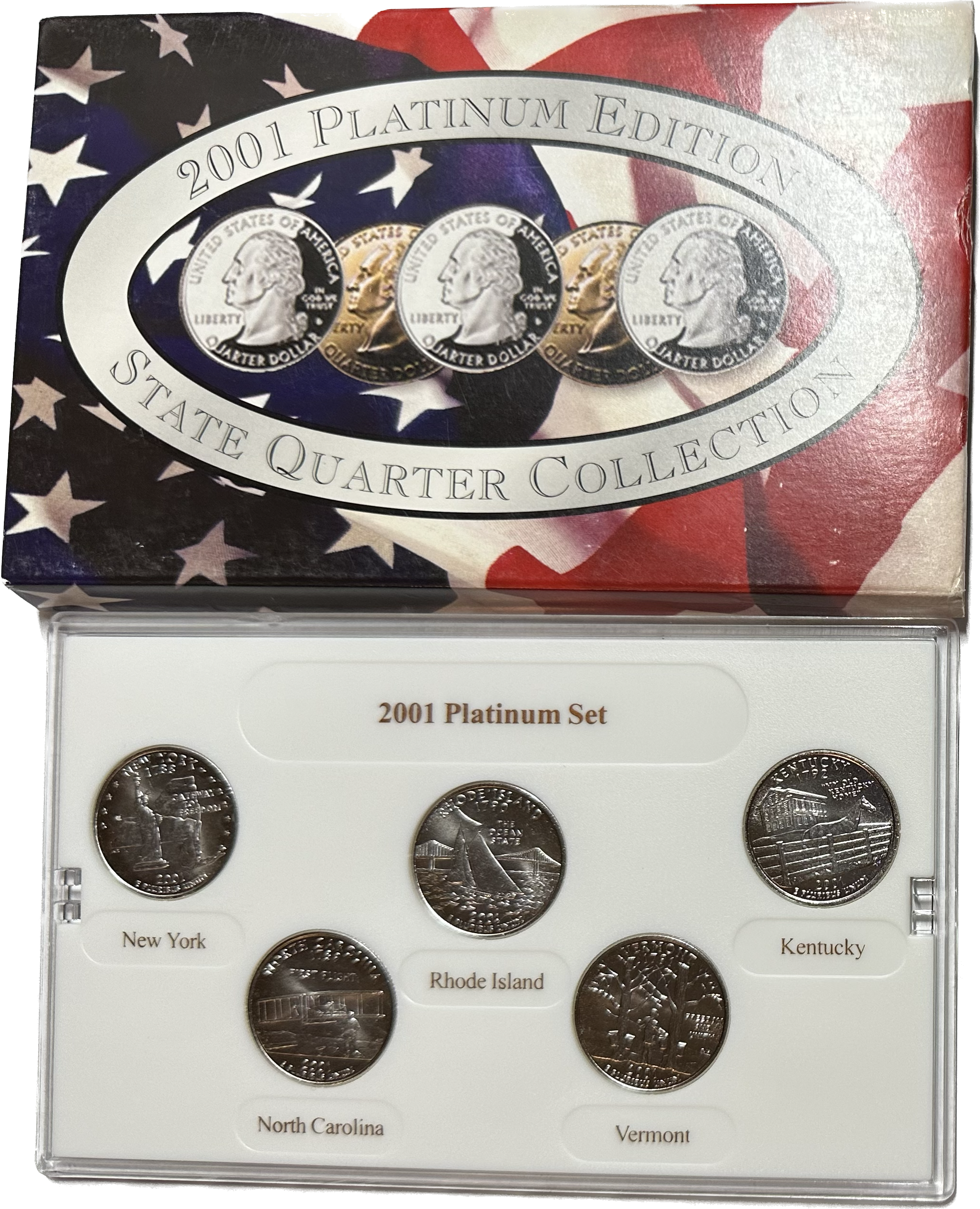 2001-P U.S. Platinum Edition State Quarter Collection - 5 Platinum Layered Quarters with COA - NY, RI, KY, NC & VT